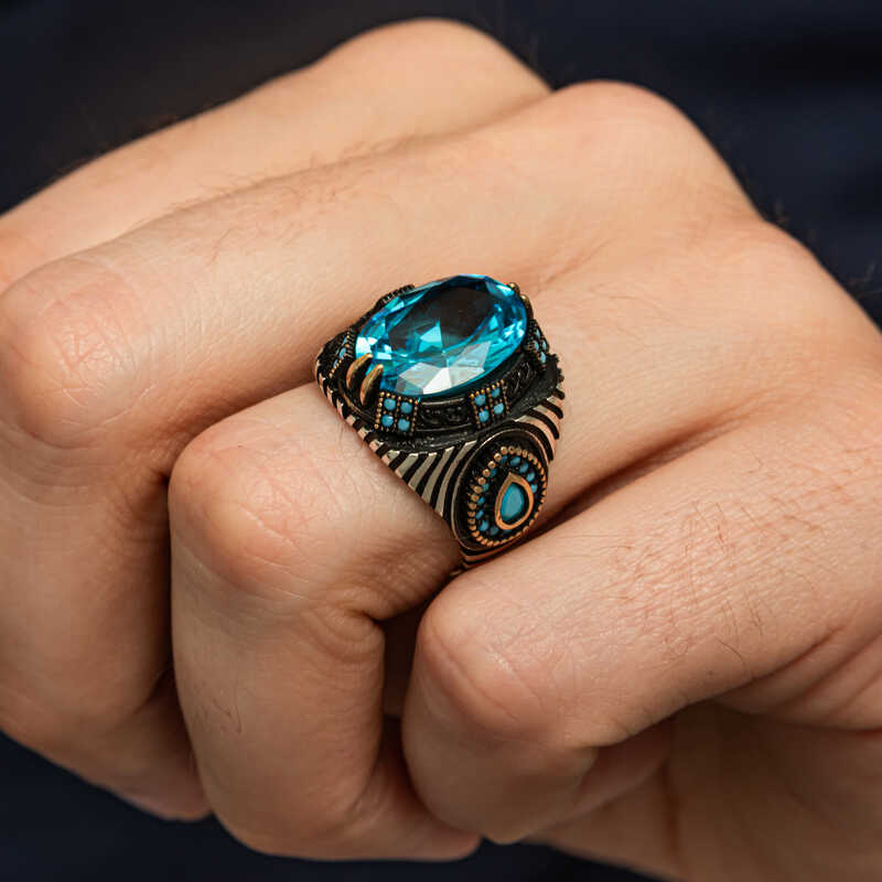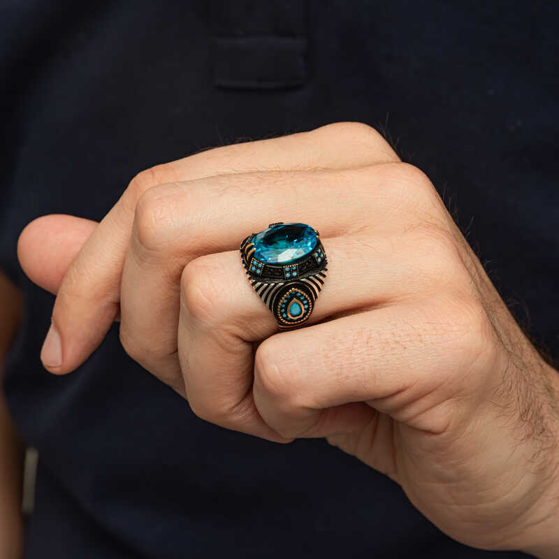 Gümüş Mavi Fasetli Taşlı Erkek Yüzük