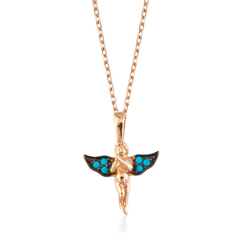 Melekler saflığın ve temizliğin simgeleridir. Bu nedenle melek kolye hediye edilen kişiye melek kadar saf ve temiz olduğu mesajı verilmektedir… Melek bayan kolye; sevgilinize doğum günü , sevgililer günü yada özel günlerde hediye ederek onları mutlu edebilirsiniz… Bu özel melek tasarımı 925 ayar gümüşten imal edilmiştir… Tasarım melek kanadı bayan kolye üzerinde bulunan taşlar firuzedir. Bu bayan gümüş kolye üzerine rose kaplama yapılmıştır. Rose kaplama yapılan tüm kolyeler parlaklığını uzun süre muhafaza eder, gümüşe pembe rengi verir , oksitlenmeyi geciktirir. Zincir boyu ortalama 45 cm"dir. Tüm gümüş kolyelerde olduğu gibi bu gümüş melek bayan kolye de el emeği ile üretilmiştir. Gümüş ve değerli taşlar nedeniyle ürün ağırlığında ± %10 sapma olabilmektedir.
