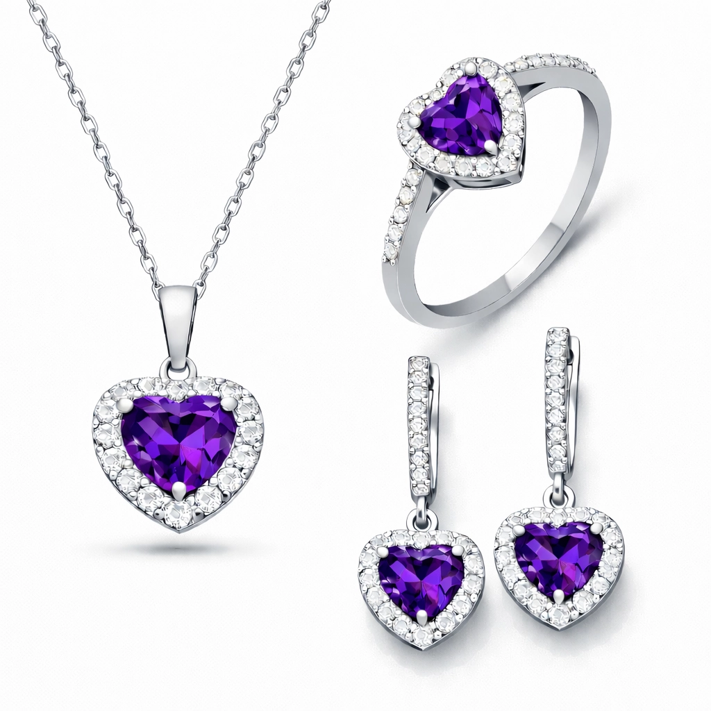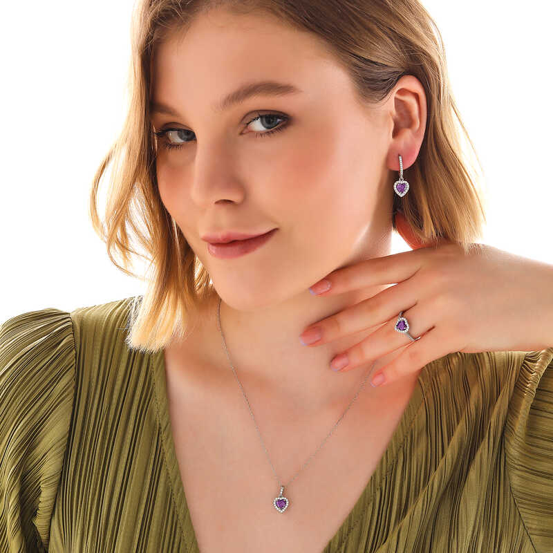 Gümüş Mor Taşlı Kalpli Kadın Set
