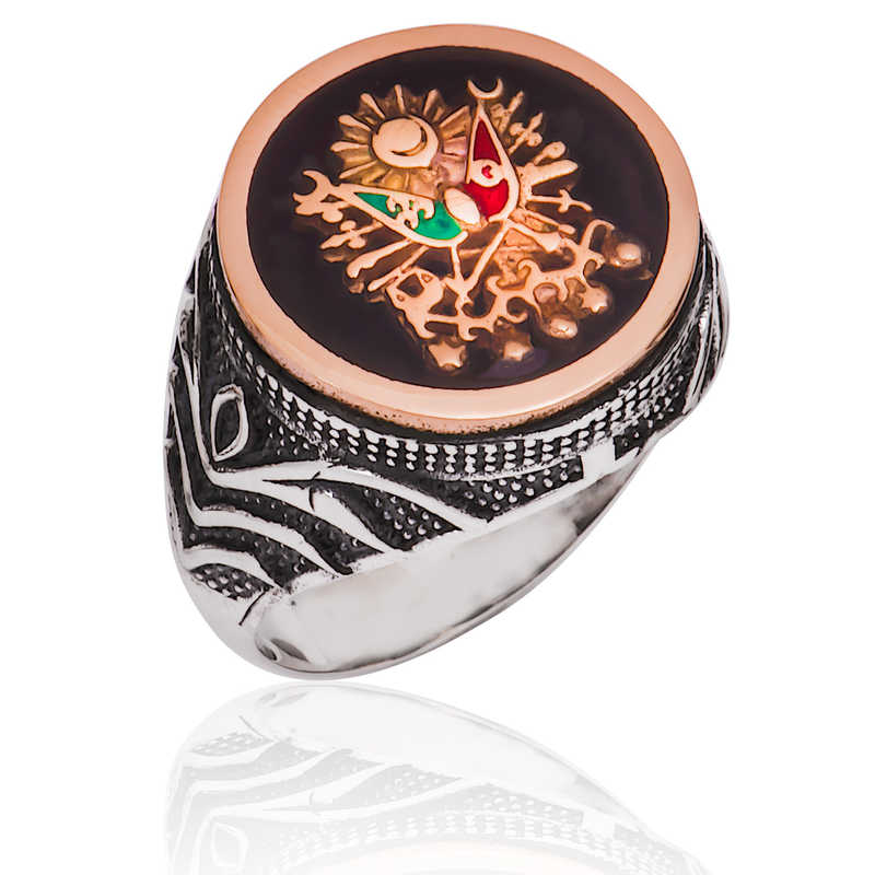Osmanlı İmparatorluğu Devlet Arması, 19. yüzyılda Avrupa Birleşik Krallık devlet geleneğindeki nişanlardan etkilenilerek Osmanlı Devleti için hazırlanmıştır. Ondan önce, padişahların tuğraları devlet nişanı yerine geçiyordu. Osmanlı nişanının son hali, 17 Nisan 1882"de Sultan II. Abdülhamit tarafından yürürlüğe konmuştur. Osmanlı Devlet Nişanı"nın içinde iki tane bayrak vardır. Kırmızı zeminde ay-yıldız bulunan bayrak Osmanlı Hanedanı"nı, yeşil zemindeki bayrak İslam halifeliğini simgelemektedir. Terazi, Osmanlı adaletini, terazide bulunan kitaplar da adaletin kaynağı olan Osmanlı kanunnamelerini ve Kur"an-ı Kerim"i temsil etmektedir. Siz de Osmanlı temalı, gümüş erkek yüzüğü severek kullanabilir, sevdiklerinize hediye edebilirsiniz. Yüzük 925 ayar gümüşten imal edilmiştir. Gümüş üzerine oksit kaplama yapılmıştır. Üzeri şeffaf mine kaplamadır. Ürünlerimizin tamamı el emeği ile üretilmiştir. Gümüş ve değerli taşlar nedeniyle ürün ağırlığında ± %10 sapma olabilmektedir.