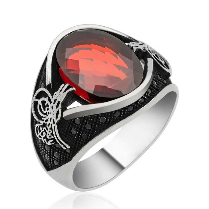 Tuğra, padişahın ismi ve lakabı bulunan alâmet, imza. Tuğra, hat sanatının bir kolu halinde yüzyıllar boyunca usta hattatlar eliyle yazılmıştır. Türkçe’de kelime olarak padişahın ismini ihtiva eden özel bir işaret, padişahın imzası gibi anlamlar ifade eder. Aslı Oğuz lehçesinde tuğra olup, hükümdarın basılmış imzası demektir. Yüzük 925 ayar gümüşten imal edilmiştir. Gümüşe oksit kaplama yapılmıştır, üzerindeki taş zirkondur. Ürünlerimizin tamamı el emeği ile üretilmiştir. Gümüş ve değerli taşlar nedeniyle belirtilen ortalama ürün ağırlığında ± %10 sapma olabilmektedir.
