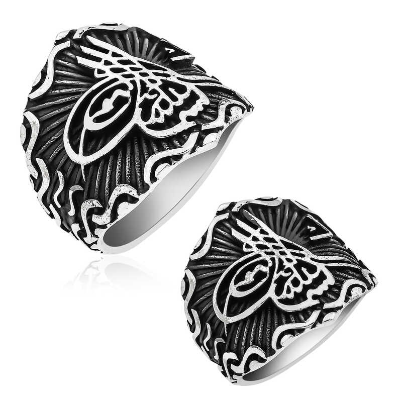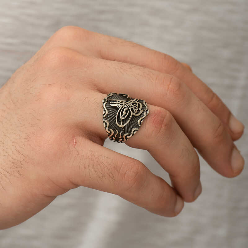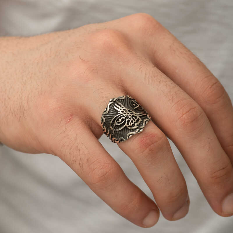 Tuğra, Osmanlı sultanlarının imzası anlamına gelir. Her tuğra; ona ait olan padişahın ismini, varlığını, hükümdarlığını ifade eder. Tuğra sembolü her padişaha göre farklı olmak üzere birçok şekilde günümüze ulaşmıştır. Tuğra; Osmanlının her döneminde korunmuş, önemini hiç kaybetmemiştir. Ve zamanla hat sanatımızda da önemli bir yere sahip olup, günümüzde hattatlar tarafından sanatsal olarak yaşatılmaktadır. Bu sanatı yansıtan gümüş yüzüğü severek kullanabilir ve sevdiklerinize hediye edebilirsiniz. Osmanlı Tuğrası Erkek Yüzük Modeli 925 ayar gümüşten imal edilmiştir. Gümüş üzerine oksit kaplama yapılmıştır. Tüm gümüş erkek yüzüklerinde olduğu gibi gümüş Osmanlı Tuğrası erkek yüzük modeli de tamamen el emeği ile üretilmiştir. Gümüş ve değerli taşlar nedeniyle belirtilen ortalama ürün ağırlığında ± %10 sapma olabilmektedir.