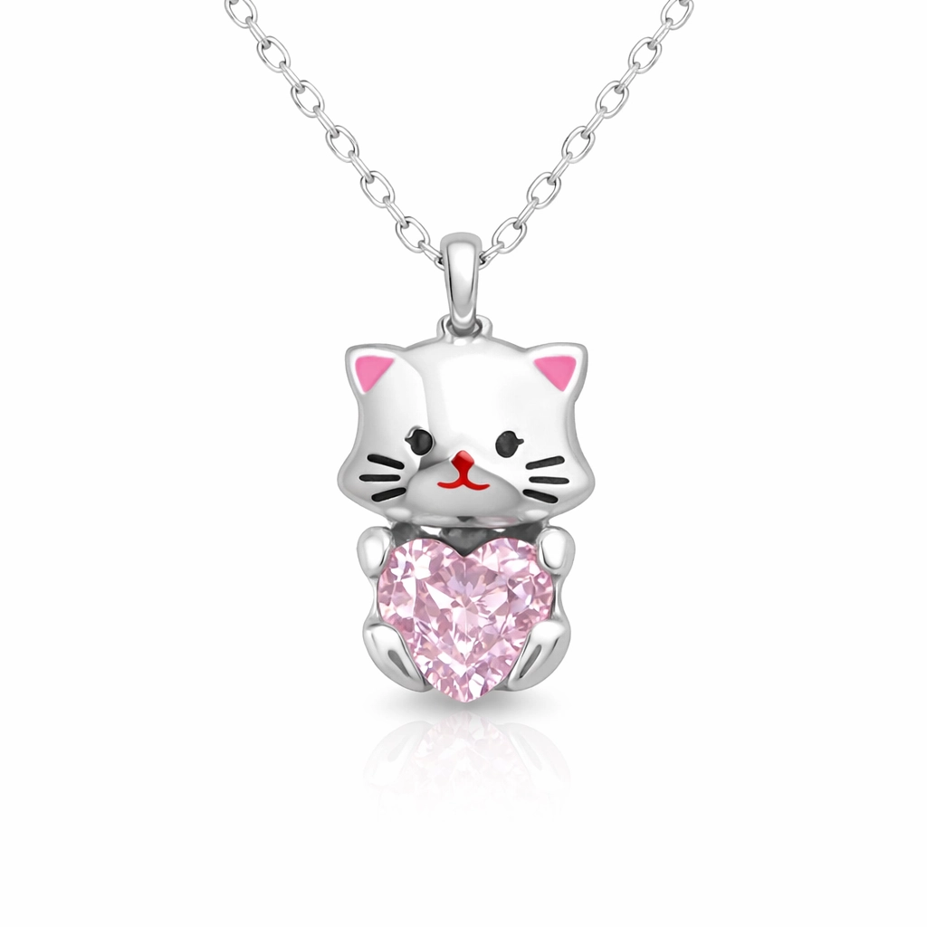 Gümüş Pembe Taşlı Sevimli Kedi Kadın Kolye