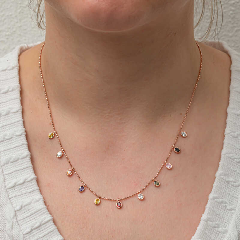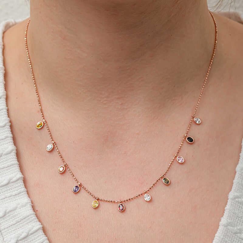 Kalbimizin ve ruhumuzun en eğlenceli tarafı olan rengarenk hayal dünyamızın yansıması özel tasarım renkli kolyeler… Bu şık kolyeyi doğum günü hediyesi, sevgililer günü hediyesi veya annelere hediye olarak özel günlerde tercih edilebilecek mükemmel bir seçenektir. Renkli kadın kolye 925 ayar gümüşten üretilmiştir.Gümüş üzerine rose kaplama yapılmıştır. Rose kaplama yapılan kadın şans kolyeleri parlaklığını uzun süre muhafaza eder ve oksitlenmesi gecikir. Tüm gümüş kolyelerde olduğu gibi gümüş renkli kadın kolye modeli de el emeği ile üretilmiştir. Gümüş ve değerli taşlar nedeniyle belirtilen ortalama ürün ağırlığında ± %10 sapma olabilmektedir.