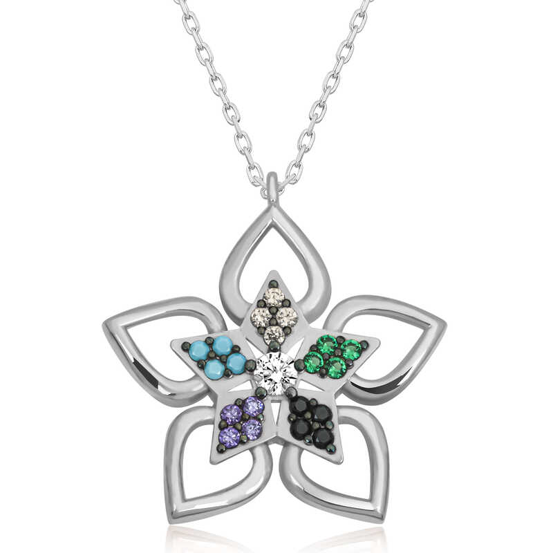 Sevdiklerinize duygularınızı ifade etmenin en özel ve zarif yolu O’na gönderebileceğiniz şık, rengarenk ve mis kokulu çiçeklerdir. Özel günlerde verilecek hediyeler arasında olan çiçek, bu kez farklı bir yorumla tasarlandı… Renkli taşlı çiçek kolye sevgisini bir kez daha anlatmak isteyenleri, sen bir çiçeksin demek isteyenleri bekliyor. Bu özel tasarım, çiçek kadın kolye 925 ayar gümüşten imal edilmiştir. Gümüş üzerine rodyum kaplama yapılmıştır. Rodyum kaplama yapılan gümüş kadın kolye modelleri parlaklığını uzun süre muhafaza eder ve oksitlenmesi gecikir. Kolye üzerinde bulunan taşlar zirkondur. Tüm kadın gümüş kolye modellerinde olduğu gibi gümüş çiçek kadın kolye de el emeği ile üretilmiştir. Gümüş ve değerli taşlar nedeniyle belirtilen ürün ağırlığında ± %10 sapma olabilmektedir.
