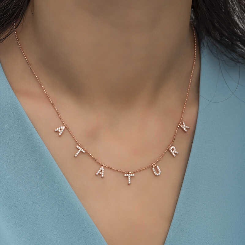Türkiye Cumhuriyeti’nin kurucusu ve ilk cumhurbaşkanı Mustafa Kemal Atatürk’ün ismi her an yanınızda taşımak ve sevdiklerinizle paylaşmak için kaçırılmayacak bir kolye ile karşı karşıyasınız. Anlam itibariyle sevdiklerinize hediye edebileceğiniz şık hediyelerden biri olacaktır. Bu anlamlı kolye 925 ayar gümüşten imal edilmiştir. Gümüş Atatürk yazılı bayan kolye rose kaplama yapılmıştır. Rose kaplama yapılan gümüş bayan kolye modelleri parlaklığını uzun süre muhafaza eder. Tüm gümüş bayan kolye modellerinde olduğu gibi gümüş Atatürk yazılı bayan kolye modeli de el emeği ile üretilmiştir. Gümüş ve değerli taşlar nedeniyle belirtilen ürün ağırlığında ± %10 sapma olabilmektedir.