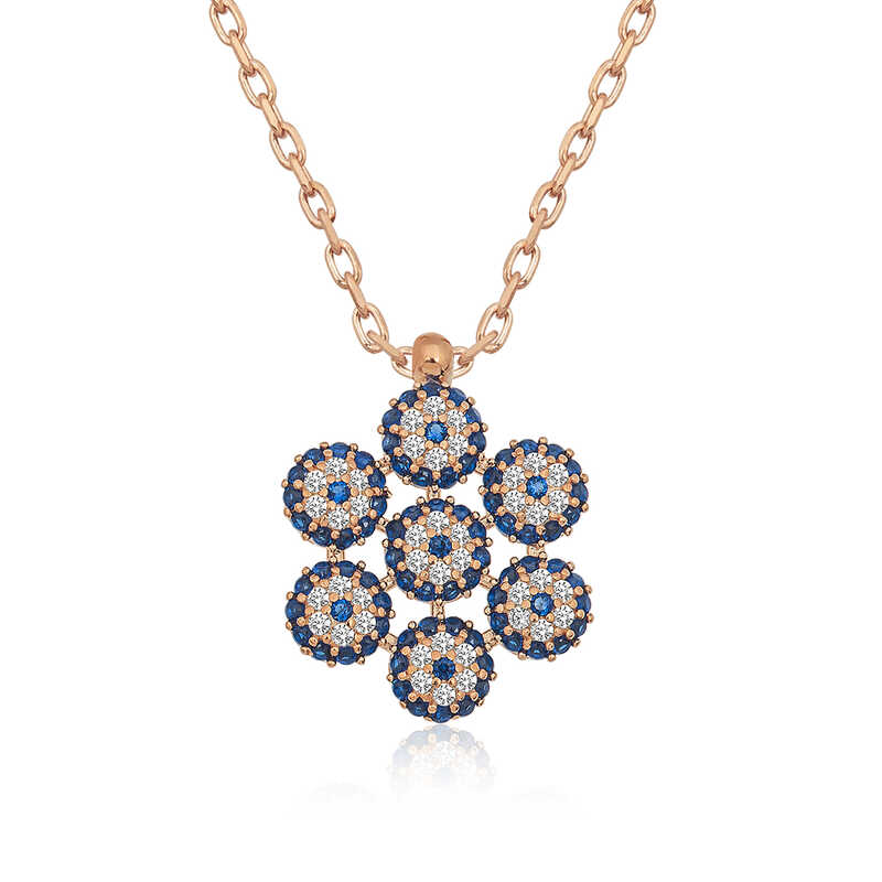 Bir çok kültürde kötü enerjinin zararlarından korunmak için çeşitli tılsımlar kullanılmıştır. Doğu kültürlerinin çoğunda kullanılan tılsım ise gözdür. Nazar boncuğu da göz şeklinden ilhamla tasarlanmıştır. Mavi rengin seçilmesi de tesadüf değildir. Renkli gözlü kişilerin enerjisini daha etkili yansıttığı inancı gereği nazar boncukları çoğunlukla mavi olarak tasarlanır. Güzelliğiyle göz kamaştıran, nazardan korunmasını istediğiniz kişilere ve sevdiklerinize çiçek model nazar göz kolyeyi armağan edebilirsiniz. Zirkon taşlı nazar bayan kolyenin zinciri 925 ayar gümüşten imal edilmiştir. Gümüş üzerine rose kaplama yapılmıştır. Rose kaplama yapılan gümüş nazar kolye modelleri parlaklığını uzun süre muhafaza eder ve oksitlenmesi gecikir. Bu çiçek model nazar bayan kolye modeli diğer tüm gümüş bayan kolye modellerinde olduğu gibi el emeği ile üretilmiştir. Gümüş ve değerli taşlar nedeniyle belirtilen ortalama ürün ağırlığında ± %10 sapma olabilmektedir.