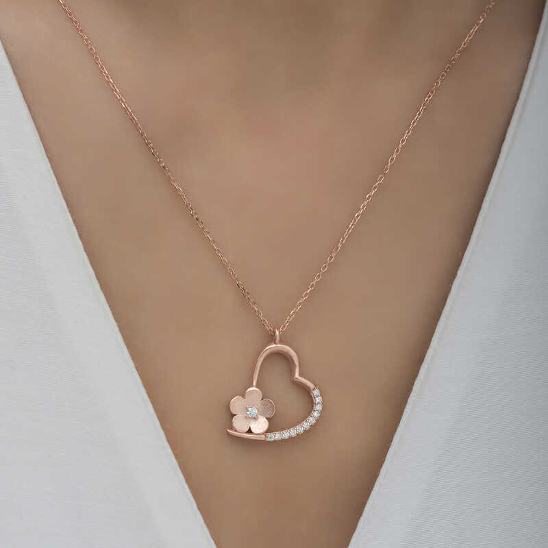 Kalp simgesi daima koşulsuz sevginin ve aşkın sembolü olmuştur. Dini öğretilerde ise kalbin gücü sınırsızdır. Çünkü kalp Yaradanın evi, bizim ise evrene açılan gerçeklik kapımızdır. Bu şık gümüş çiçekli kalp kolye; doğum günü hediyesi, sevgililer günü hediyesi veya annelere hediye olarak özel günlerde tercih edilebilecek mükemmel bir seçenektir. Gümüş çiçekli kalp kadın kolye 925 ayar gümüşten imal edilmiştir. Bu kolye üzerinde rose kaplama yapılmıştır. Rose kaplama yapılan gümüş kadın kolye modelleri parlaklığını uzun süre muhafaza eder. Üzerinde bulunan taşlar zirkondur. Tüm gümüş kadın kolye modellerimizde olduğu gibi gümüş çiçekli kalp kadın kolye modeli de el emeği ile üretilmiştir. Gümüş ve değerli taşlar nedeniyle belirtilen ortalama ürün ağırlığında ± %10 sapma olabilmektedir.