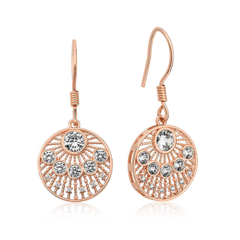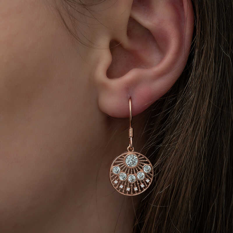 Beyaz zirkon taşlarla süslenmiş etnik desenli bayan küpe, şık ve ışıltıyı sevenler için tasarlandı. Günün her anında severek kullanabileceğiniz, herkesin beğenisini toplayabilecek ve göz kamaştırabilecek bir üründür. Gümüş etnik desenli bayan küpe 925 ayar gümüşten imal edilmiştir. Bu küpe üzerine rose kaplama yapılmıştır. Rose kaplama yapılan ürünler parlaklığını uzun süre muhafaza eder ve gümüşü bakır rengine dönüştürür. Üzerinde bulunan taşlar zirkon"dur. Tüm gümüş bayan küpe modellerinde olduğu gibi gümüş etnik desenli bayan küpe modeli de el emeği ile üretilmiştir. Gümüş ve değerli taşlar nedeniyle belirtilen ortalama ürün ağırlığında ± %10 sapma olabilmektedir. Ürünlerimizin tamamı el emeği ile üretilmiştir.