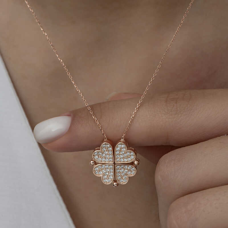 Gümüş Rose Kalpli Açılabilen Yonca Kadın Kolye