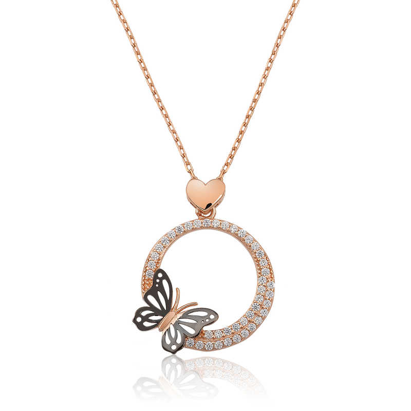 Kadim bilgelikte Kelebek, direkt ruhun sembolüdür, ruhun özgürlüğünü, hafifliğini ve zarafetini simgeler. Yeniden doğuşu da sembolize eden kelebek, kalpli kolye ile aşkta yeniden doğuşu simgelemektedir. Şık bir görünüm yakalamak isteyen tüm bayanlara hitap eden, modası geçmeyecek olan kelebek ve kalbin yer aldığı gümüş kolye sizleri bekliyor. Gümüş kalpli kelebek çemberi bayan kolye; doğum günü hediyesi, sevgililer günü hediyesi veya annelere hediye olarak özel günlerde tercih edilebilecek mükemmel bir seçenektir. Kalpli kelebek çemberi bayan kolye 925 ayar gümüşten imal edilmiştir. Gümüş üzerine rose kaplama yapılmıştır. Rose kaplama yapılan bayan kolyeler parlaklığını uzun süre muhafaza eder, gümüşü pembe renge dönüştürür ve oksitlenmesini geciktirir. Üzerinde bulunan taşlar zirkon"dur. Tüm bayan kolyelerde olduğu gibi gümüş kalpli kelebek çemberi kolye de el emeği ile üretilmiştir. Gümüş ve değerli taşlar nedeniyle belirtilen ortalama ürün ağırlığında ± %10 sapma olabilmektedir.