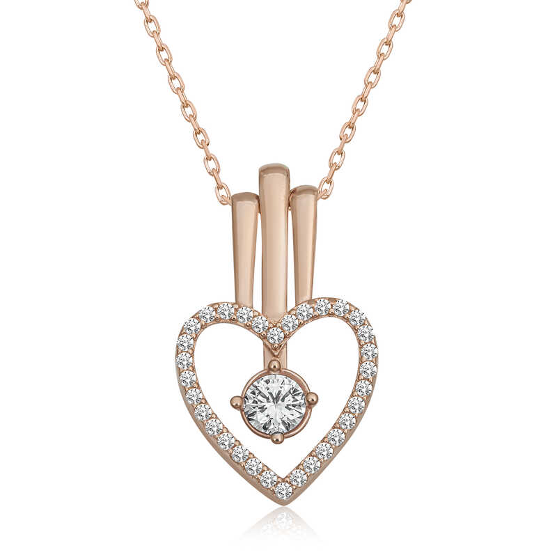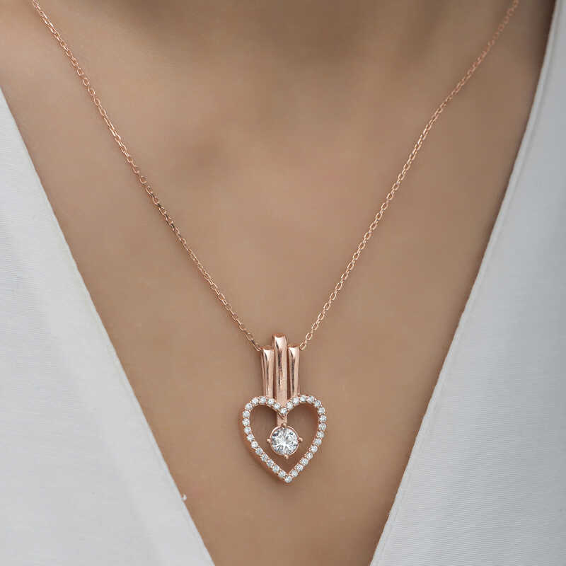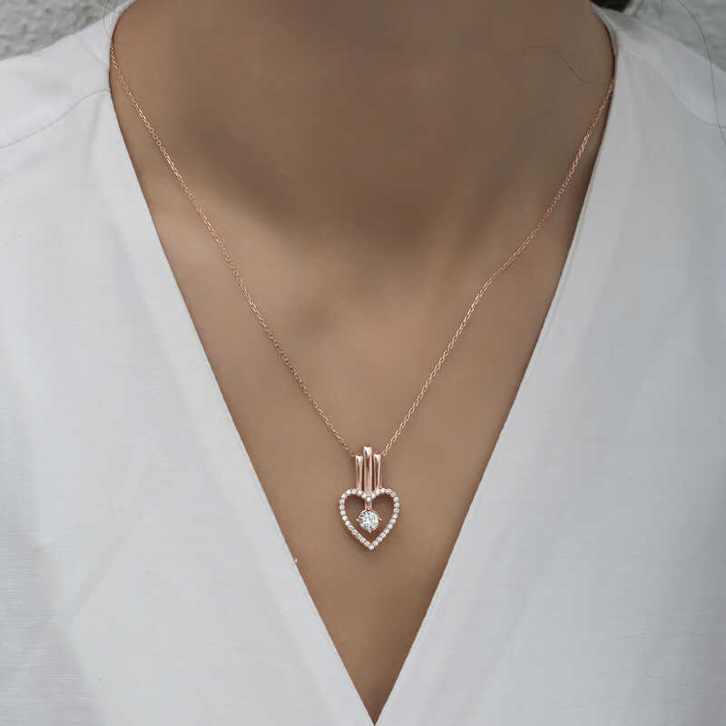 Gümüş Rose Kalpli Tek Taş Kadın Kolye