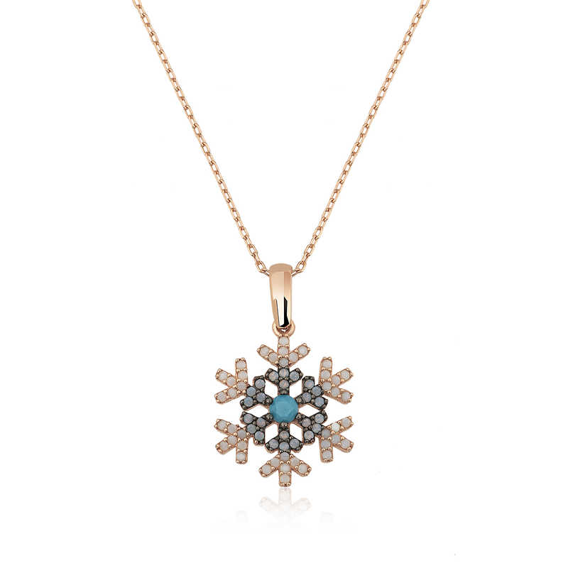 Kadınların ışıltısı, berraklığı kar tanesine benzetilip özel olarak tasarlanmıştır. Kar tanelerinin her birinin bayanlar gibi eşsiz ve ayrı kıymette olması onları özel kılan bir diğer özelliktir. Asilliği her dönemde dikkat çekmeyi başarmıştır. Bunun yanında insanların tıpkı kar taneleri gibi birbirlerine zarar vermeden de mutlu bir şekilde yaşayabileceklerini sembolize etmektedir. Bu şık kolye; doğum günü hediyesi, sevgililer günü hediyesi veya annelere hediye olarak özel günlerde tercih edilebilecek mükemmel bir seçenektir. Kolye, 925 ayar gümüşten imal edilmiştir. Gümüş üzerine rose altın kaplama yapılmıştır. Rose altın kaplama yapılan ürünler parlaklığını uzun süre muhafaza eder, gümüşü pembe renge dönüştürür ve oksitlenmesi gecikir. Tüm gümüş bayan kolyelerde olduğu gibi bu gümüş kar tanesi bayan kolye de tamamı el emeği ile üretilmiştir. Gümüş ve değerli taşlar nedeniyle belirtilen ortalama ürün ağırlığında ± %10 sapma olabilmektedir.