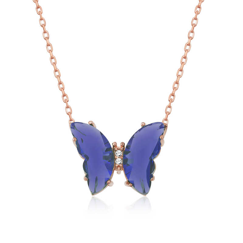 Gümüş Rose Mavi Cam Kelebek Kolye