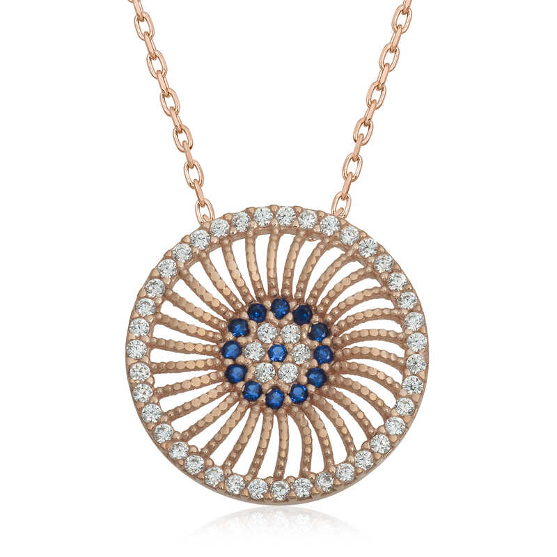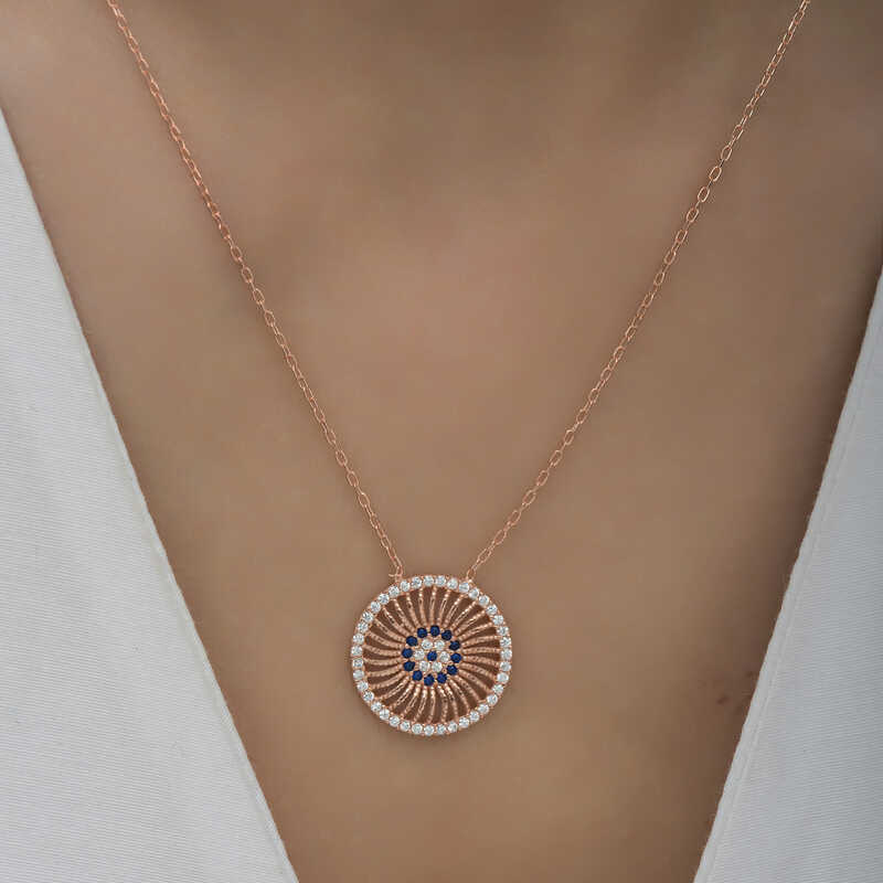 Birçok kültürde kötü enerjinin zararlarından korunmak için çeşitli tılsımlar kullanılmıştır. Doğu kültürlerinin çoğunda kullanılan tılsım ise gözdür. Nazar boncuğu da göz şeklinden ilhamla tasarlanmıştır. Mavi rengin seçilmesi de tesadüf değildir. Renkli gözlü kişilerin enerjisini daha etkili yansıttığı inancı gereği nazar boncukları çoğunlukla mavi olarak tasarlanır. Güzelliğiyle göz kamaştıran, nazardan korunmasını istediğiniz kişilere ve sevdiklerinize nazar kolyeyi armağan edebilirsiniz. Nazar kadın kolye modeli 925 ayar gümüşten imal edilmiştir. Gümüş üzerine rose kaplama yapılmıştır. Rose kaplama yapılan gümüş nazar kolye modelleri parlaklığını uzun süre muhafaza eder ve oksitlenmesi gecikir. Kolye üzerinde bulunan taşlar zirkon"dur. Bu nazar kadın kolye modeli diğer tüm gümüş kadın kolye modellerinde olduğu gibi el emeği ile üretilmiştir. Gümüş ve değerli taşlar nedeniyle belirtilen ortalama ürün ağırlığında ± %10 sapma olabilmektedir.