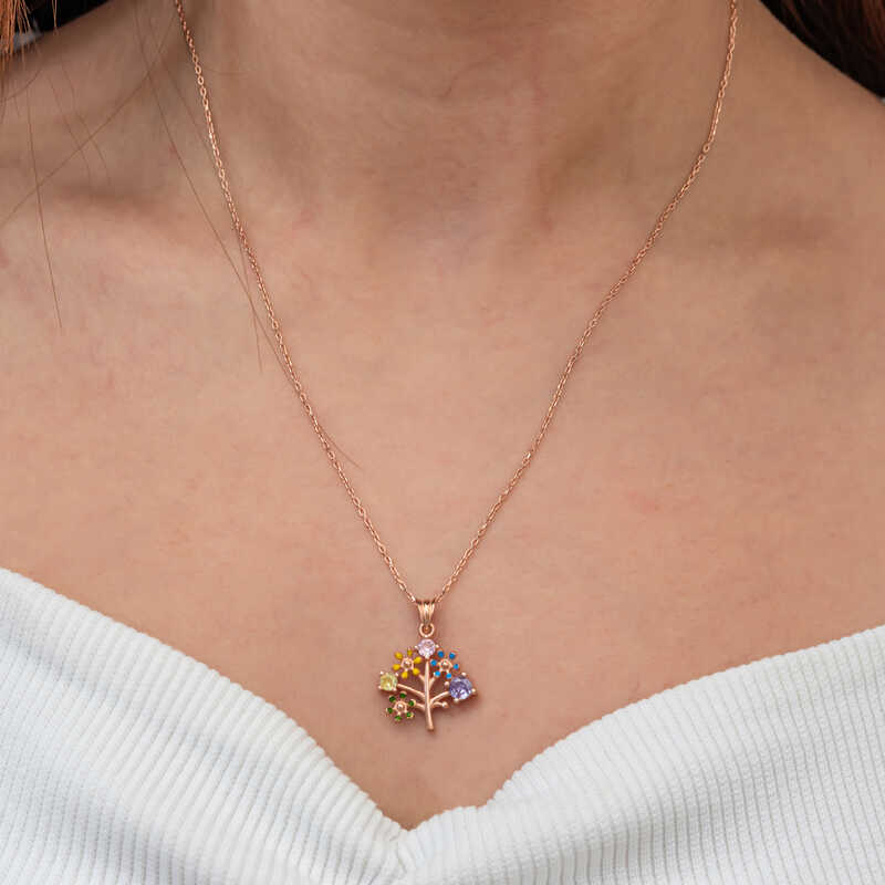 Gümüş Rose Renkli Hayat Ağacı Kadın Kolye