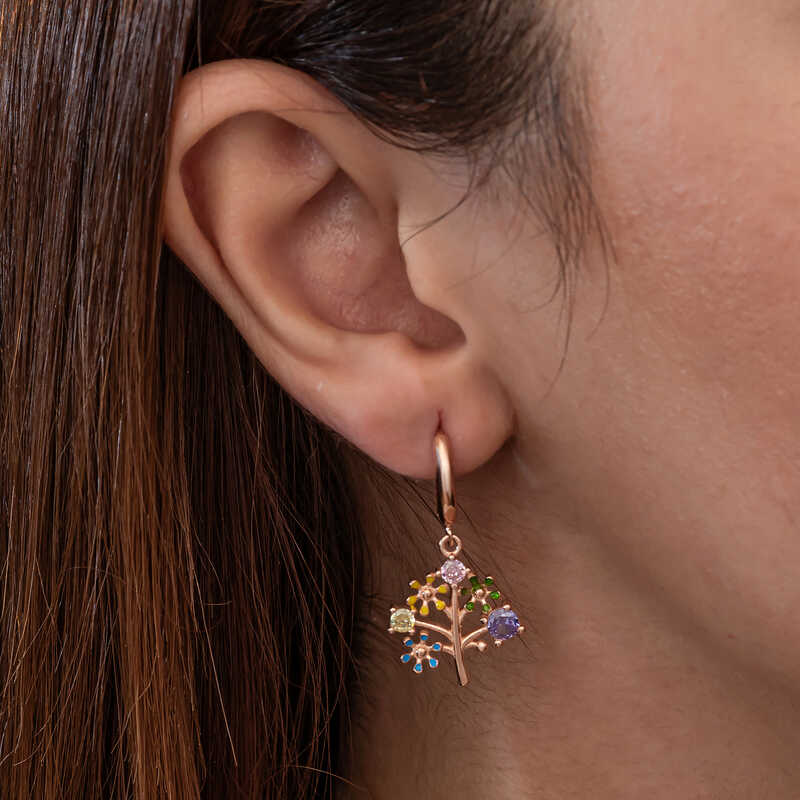 Gümüş Rose Renkli Taşlı Hayat Ağacı Kadın Küpe