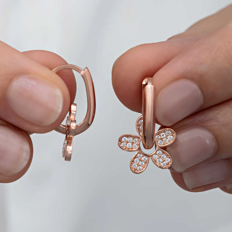 Özel günlerde kadınların tercihleri arasında ilk sıralarda yer alan küpeler pek çok kadının kurtarıcısıdır. Spor ve klasik her kıyafetle kombinleyebileceğiniz çiçek desenli küpe, çok uygun fiyatla karşınızda. Zarif çiçek motifi üzerine işlenen küçük beyaz zirkon taşlarla desteklenmiş bu modelle şıklığınızı tamamlayabilirsiniz. Bu küpe modeli 925 ayar gümüşten imal edilmiştir. Gümüş üzerine rose kaplama yapılmıştır. Rose kaplama yapılan gümüş küpe modelleri parlaklığını uzun süre muhafaza eder ve oksitlenmesi gecikir. Tüm gümüş küpelerde olduğu gibi gümüş çiçek desenli kadın küpe modeli de tamamen el emeği ile üretilmiştir. Gümüş ve değerli taşlar nedeniyle belirtilen ortalama ürün ağırlığında ± %10 sapma olabilmektedir.