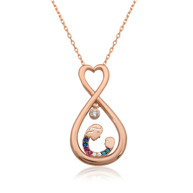 Çocuk ve anne arasındaki sevgiyi temsil eden özel bir tasarımdır. Annenize olan bağlılığınızı belirtmek için alabileceğiniz en uygun hediyelerden biri bu anne çocuk sevgisi kolye olacaktır. Anneniz için tasarlanan bu özel tasarım kalpli anne çocuk kolyesi 925 ayar gümüşten imal edilmiştir. Gümüş üzerine rose  kaplama yapılmıştır. Rose kaplama yapılan gümüş anne çocuk kolye modelleri parlaklığını uzun süre muhafaza eder ve oksitlenmesi gecikir. Kolye üzerinde bulunan taşlar zirkondur. Gümüş olan zincir boyu ortalama 45 cm’dir. Gümüş sonsuz kalpli anne çocuk kolyesi el emeği ile üretilmiştir.  Gümüş ve değerli taşlar nedeniyle belirtilen ortalama ürün ağırlığında ± %10 sapma olabilmektedir.
