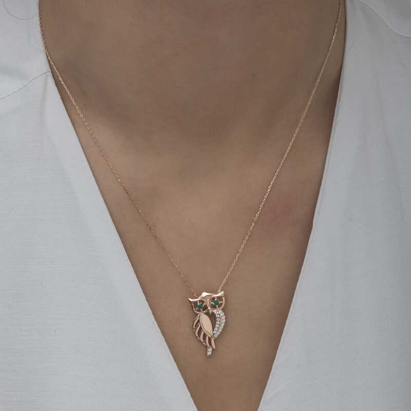 Baykuş, tarihte ve farklı kültürlerde zengin anlamlara sahip mitolojik bir hayvandır. Baykuş aksesuarlarının bu kadar sevilme nedeni güçlü sembolik anlamları olmasından kaynaklanıyor. Gece görme yeteneği sayesinde sezgisel güçlerinin kuvvetli olmasından dolayı simgesel olarak bilgeliği temsil etmektedir. Siz de bu kolyeyi günlük hayatta severek kullanabilir sevdiklerinize özel günlerde hediye edebilirsiniz. Bu şık tasarım kolye 925 ayar gümüşten imal edilmiştir. Gümüş üzerine rose kaplama yapılmıştır. Tüm gümüş ürünlerde olduğu gibi gümüş yeşil gözlü baykuş kadın kolye de tamamı el emeği ile üretilmiştir. Gümüş ve değerli taşlar nedeniyle belirtilen ortalama ürün ağırlığında ± %10 sapma olabilmektedir.
