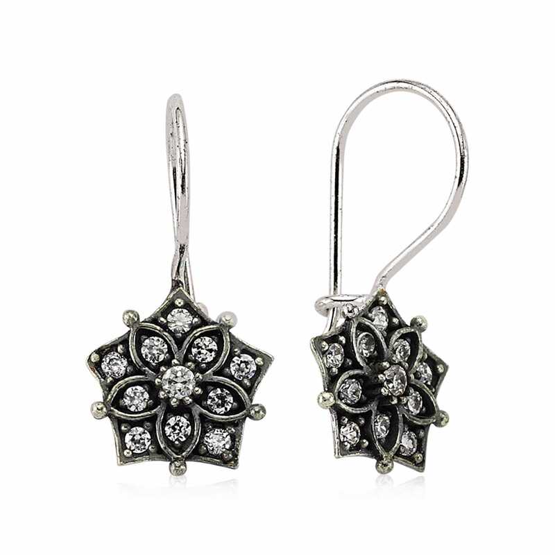 Işıl ışıl zirkon taşlarla süslenmiş bu şık ve modern küpe; göz alıcı çiçeklerle süslendi… Bu farklı tasarımı; doğum günü hediyesi, sevgililer günü hediyesi veya annelere hediye olarak özel günlerde tercih edebileceğiniz çok şık bir seçenektir. Küpe; 925 ayar gümüşten imal edilmiştir. Gümüş üzerine oksit kaplama yapılmıştır. Oksit kaplama yapılan gümüş sallantılı küpeler parlaklığını uzun süre muhafaza eder, kararması gecikir. Tüm gümüş küpe modellerinde olduğu gibi gümüş sallantılı çiçek küpe modeli de el emeği ile üretilmiştir. Üzerinde bulunan taşlar zirkondur. Gümüş ve değerli taşlar nedeniyle belirtilen ortalama ürün ağırlığında ± %10 sapma olabilmektedir.