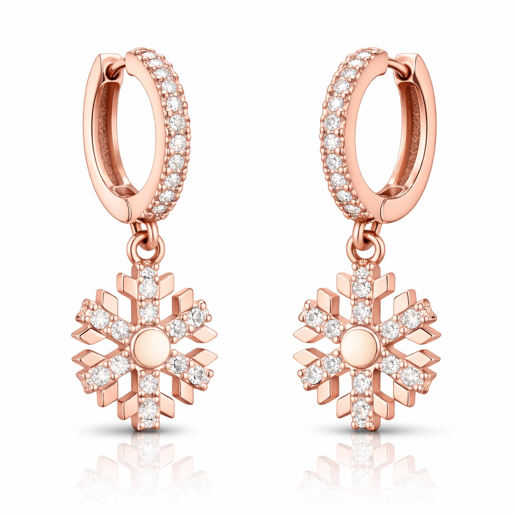 Kadınların ışıltısı, berraklığı kar tanesine benzetilip özel olarak tasarlanmıştır. Kar tanelerinin her birinin bayanlar gibi eşsiz ve ayrı kıymette olması onları özel kılan bir diğer özelliktir. Asilliği her dönemde dikkat çekmeyi başarmıştır. Bunun yanında insanların tıpkı kar taneleri gibi birbirlerine zarar vermeden de mutlu bir şekilde yaşayabileceklerini sembolize etmektedir. Bu şık küpe; 925 ayar gümüşten imal edilmiştir. Gümüş üzerine rose kaplama yapılmıştır.Rose kaplama yapılan gümüş küpeler parlaklığını uzun süre muhafaza eder,oksitlenmesi gecikir. Üzerinde bulunan taşlar zirkondur. Gümüş küpelerin tamamında olduğu gibi gümüş sallantılı kar tanesi bayan küpe de el emeği ile üretilmiştir. Gümüş ve değerli taşlar nedeniyle belirtilen ortalama ürün ağırlığında ± %10 sapma olabilmektedir.