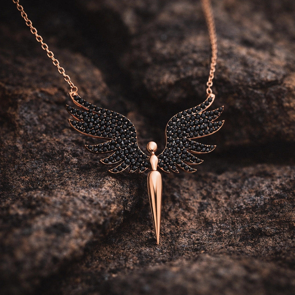 Saflığı, masumiyeti simgeleyen melek figürlü aksesuarlar sevdiğiniz kişiler için alınabilecek en güzel hediye seçeneklerinden biridir. Hayatınızda değer verdiğiniz mutlu etmek istediğiniz sevdiklerinizi, meleklere layık bir hediye ile sevindirin. Bu şık kolye modeli 925 ayar gümüşten imal edilmiştir. Gümüş üzerine rose altın kaplama yapılacaktır. Rose altın kaplama yapılan gümüş bayan kolye modelleri parlaklığını uzun süre muhafaza eder. Gümüş olan zincir uzunluğu 45 cm"dir. Kolye üzerindeki siyah taşlar zirkondur. Gümüş kolyelerin tamamında olduğu gibi gümüş siyah mikail meleği bayan kolye modeli de el emeği ile üretilmiştir. Gümüş ve değerli taşlar nedeniyle belirtilen ortalama ürün ağırlığında ± %10 sapma olabilmektedir.