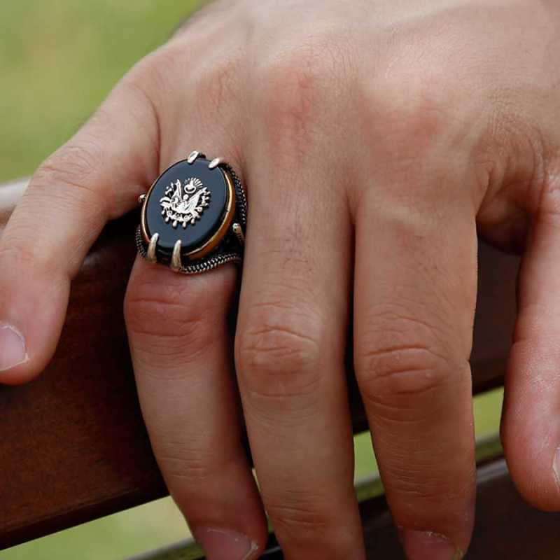 Gümüş Siyah Taşlı Kartal Pençesi Osmanlı Devlet Arması Erkek Yüzük
