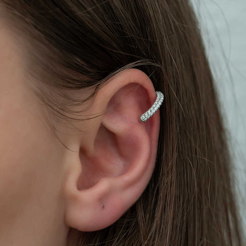 Her yıl farklı trend tasarımlara imza atılıyor. Bu yılın en popüler modelleri ise kıkırdak ürünler olarak ön plana çıkıyor. Küpelerinizi kombinleyebileceğiniz şık kıkırdak aksesuarları her an ışıl ışıl görünmenizi sağlayacak. Siz de bu şık küpeyi mücevher kutunuza kazandırabilir veya sevdiğiniz bir yakınınıza hediye olarak düşünebilirsiniz. Şık zirkon taşlı halka kıkırdak küpe, 925 ayar gümüşten imal edilmiştir. Gümüş üzerine rodyum kaplama yapılmıştır. Rodyum kaplama yapılan gümüş küpeler parlaklığını uzun süre muhafaza eder, oksitlenmesi gecikir. Üzerinde bulunan taşlar zirkondur. Tüm bayan gümüş ürünlerde olduğu gibi gümüş taşlı halka kıkırdak küpe de el emeği ile üretilmiştir. Gümüş ve değerli taşlar nedeniyle belirtilen ortalama ürün ağırlığında ± %10 sapma olabilmektedir.