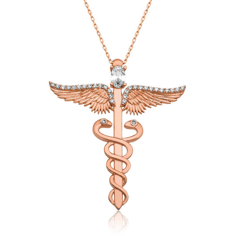 Yunan mitolojisindeki haberci ilah Hermes"in (Roma mitolojisinde Merkür), tepesinde iki kanadın ve çevresinde birbirine dolanmış iki yılanın yer aldığı asa sembolü. Hermes"in Kadüse adlı çift yılanlı asasına dolanmış tıbbın sembolü olarak şifa ile zehrin zıt güçleri ve yeniden dirilişin betimlenişi görülür, ateş çıkarma, insanları derin uykuya daldırma, uyuşturma, rüyalar vs. iletebilen, uzlaştırma gücüne sahip olduğuna inanılan asadır. Zaman ve kader çarkını anlatır. Bu ışıl ışıl ve farklı tasarımıyla göz kamaştıran kolye modeli 925 ayar gümüşten imal edilmiştir. Gümüş üzerine rose altın kaplama yapılmıştır. Rose altın kaplama yapılan gümüş kolyeler parlaklığını uzun süre muhafaza eder, oksitlenmesi gecikir. Kolye üzerinde bulunan beyaz taşlar zirkon"dur. Tüm gümüş kolyelerde olduğu gibi bu kolye modeli de tamamen el emeği ile üretilmiştir. Gümüş ve değerli taşlar nedeniyle belirtilen ortalama ürün ağırlığında ± %10 sapma olabilmektedir.