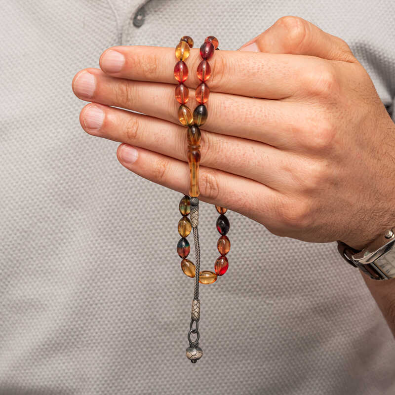 Gümüş Top Kazaz Püsküllü Sıkma Kehribar Tesbih