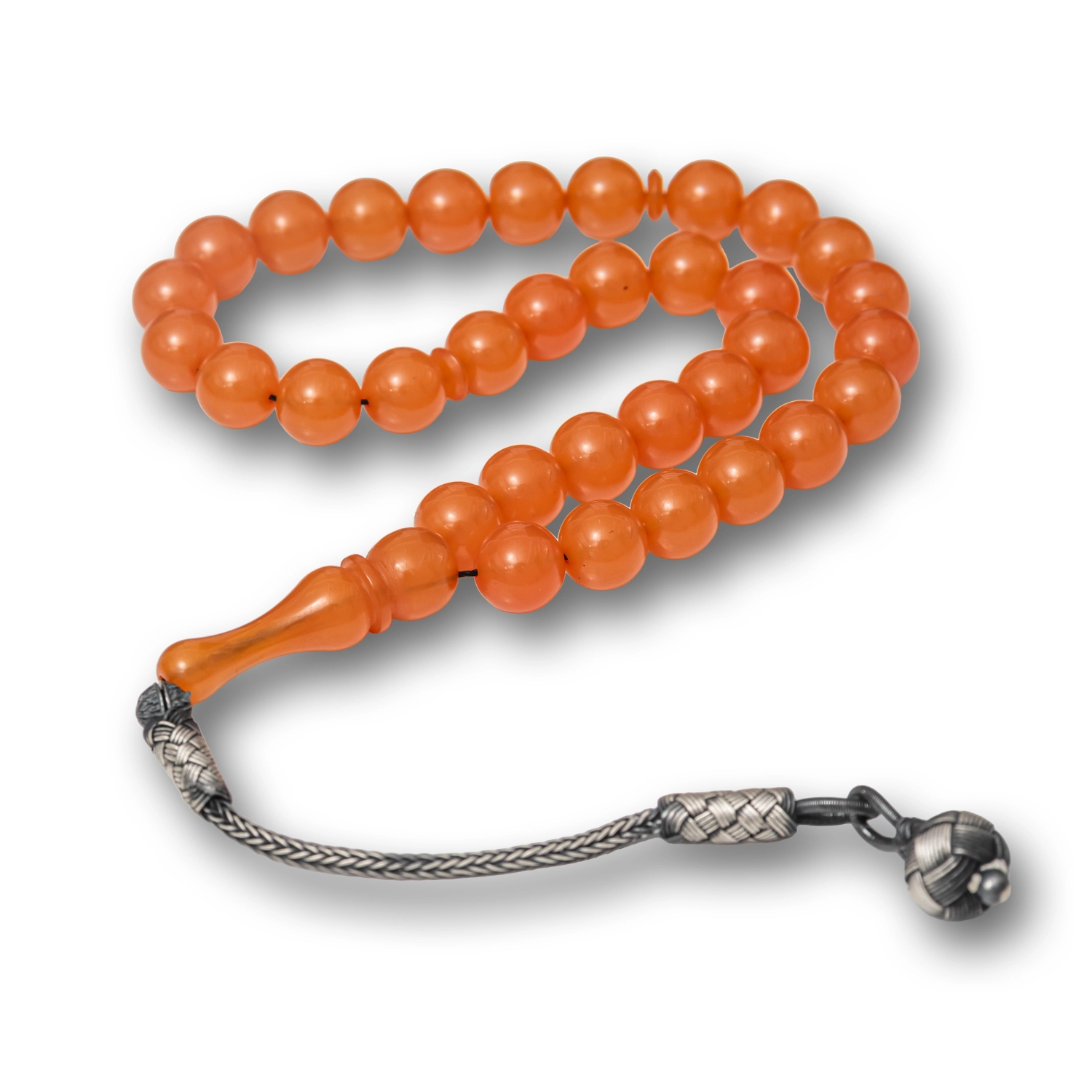 Gümüş Top Kazaz Püsküllü Turuncu Sıkma Kehribar Tesbih, canlı turuncu rengi ve ustalıkla işlenmiş detaylarıyla tesbih severler için özel olarak hazırlanmıştır. Parlak ve homojen yapıya sahip sıkma kehribar taneler, elde rahat çekim sunarken estetik görünümüyle dikkat çeker. Tesbihin en önemli tamamlayıcısı olan gümüş top kazaz püskül, geleneksel kazaz işçiliğinin zarif bir örneğidir. Dayanıklı yapısı ve şık tasarımıyla tesbihe hem değer hem de karakter kazandırır. İmame ve püskül uyumu, bütüncül ve dengeli bir duruş sağlar.Günlük kullanımın yanı sıra koleksiyonluk veya özel günlerde hediye olarak tercih edilebilecek, klasik ve zamansız bir modeldir. Gümüş ve değerli taşlar nedeniyle belirtilen ürün ağırlığında ± %10 sapma olabilmektedir.