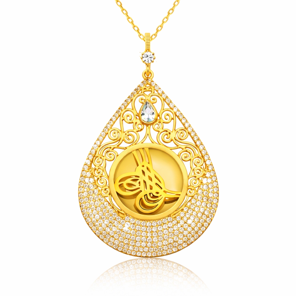 Tuğra, Osmanlı sultanlarının imzası anlamına gelir. Her tuğra; ona ait olan padişahın ismini, varlığını, hükümdarlığını ifade eder. Tuğra sembolü her padişaha göre farklı olmak üzere birçok şekilde günümüze ulaşmıştır. Tuğra Osmanlının her döneminde korunmuş, önemini hiç kaybetmemiştir. Ve zamanla hat sanatımızda da önemli bir yere sahip olup, günümüzde hattatlar tarafından sanatsal olarak yaşatılmaktadır. Bu mükemmel kolyeyi; doğum günü hediyesi, sevgililer günü hediyesi veya annelere hediye olarak özel günlerde tercih edebilirsiniz. Tuğra bayan kolye 925 ayar gümüşten imal edilmiştir. Gümüş üzerine altın kaplama yapılmıştır. Altın kaplama yapılan kolye modelleri parlaklığını uzun süre muhafaza eder, gümüş rengini sarı renge dönüştürür ve oksitlenmeyi geciktirir. Üzerinde bulunan beyaz taşlar zirkondur. Zincir uzunluğu 50 – 55 cm"dir. Tüm gümüş bayan kolyelerde olduğu gibi gümüş tuğra bayan kolye modeli de el emeği ile üretilmiştir. Gümüş ve değerli taşlar nedeniyle belirtilen ortalama ürün ağırlığında ± %10 sapma olabilmektedir.
