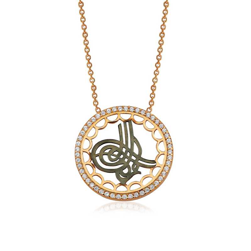 Osmanlı imparatorluğundaki padişahların imzası olarak da kullandığı tuğra sembolü kolye ile birleşerek anlamlı bir gümüş takı haline gelmiştir. Böylelikle sevdiklerinizi veya kendinizi derin bir anlama sahip olan bu kolye ile sevindirebilirsiniz. Tuğra bayan kolye modeli 925 ayar gümüşten imal edilmiştir. Gümüş üzerine rose altın kaplama yapılmıştır. Rose altın kaplama yapılan gümüş bayan kolye modelleri parlaklığını uzun süre muhafaza eder. Kolye üzerinde bulunan beyaz taşlar zirkondur. Gümüş olan zincir boyu ortalama 45 cm’dir. Gümüş tuğralı bayan kolye modeli diğer tüm gümüş bayan kolye modellerinde olduğu gibi el emeği ile üretilmiştir. Gümüş ve değerli taşlar nedeniyle belirtilen ürün ağırlığında ± %10 sapma olabilmektedir.