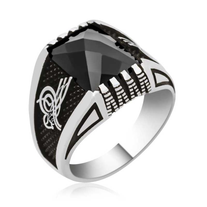 Tuğra, padişahın ismi ve lakabı bulunan alâmet, imza. Tuğra, hat sanatının bir kolu halinde yüzyıllar boyunca usta hattatlar eliyle yazılmıştır. Türkçe’de kelime olarak padişahın ismini ihtiva eden özel bir işaret, padişahın imzası gibi anlamlar ifade eder. Aslı Oğuz lehçesinde tuğra olup, hükümdarın basılmış imzası demektir. Tuğra armalı erkek yüzük 925 ayar gümüşten imal edilmiştir. Gümüş üzerine rodyum kaplama yapılmıştır. Oksit kaplama yapılan erkek yüzük modelleri otantik bir gözünüme kavuşur ve kararması gecikir. Yüzük üzerinde bulunan siyah taş zirkondur. Tüm erkek yüzük modellerinde olduğu gibi tuğralı erkek yüzük modeli de el emeği ile üretilmiştir. Gümüş ve değerli taşlar nedeniyle belirtilen ortalama ürün ağırlığında ± %10 sapma olabilmektedir.