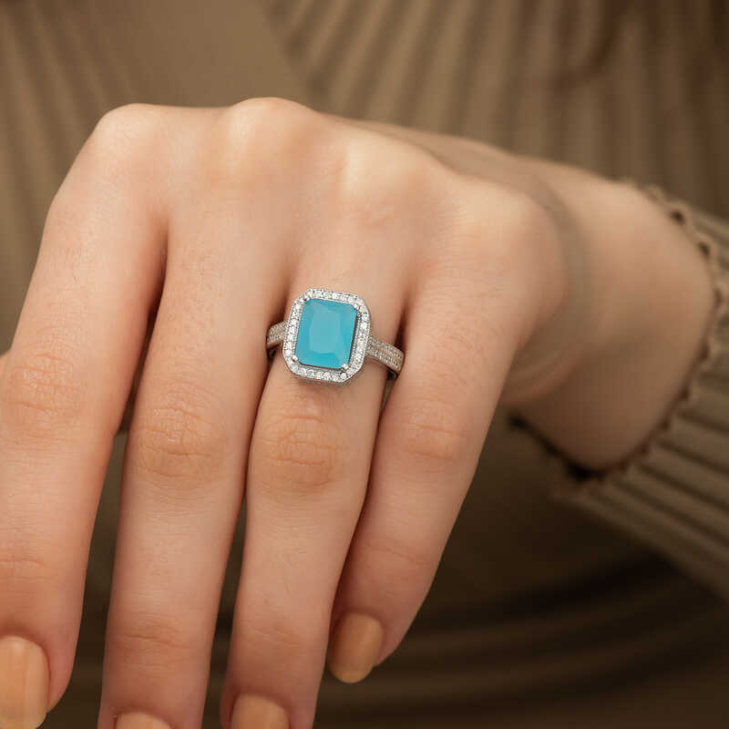 Gümüş Turkuaz Baget Kare Bayan Yüzük