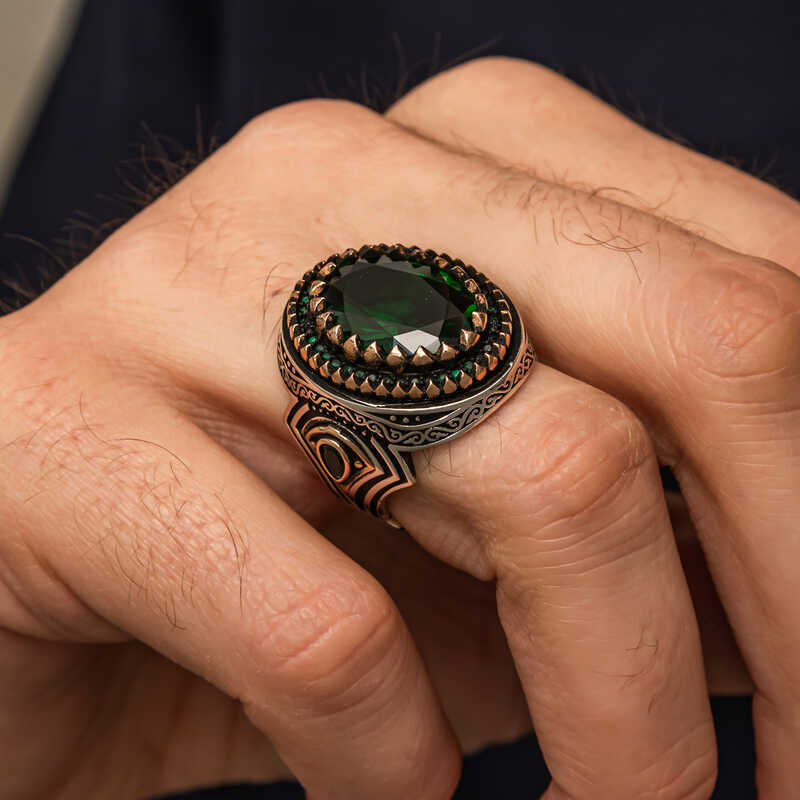 Gümüş Yeşil Zirkon Taşlı Erkek Yüzük