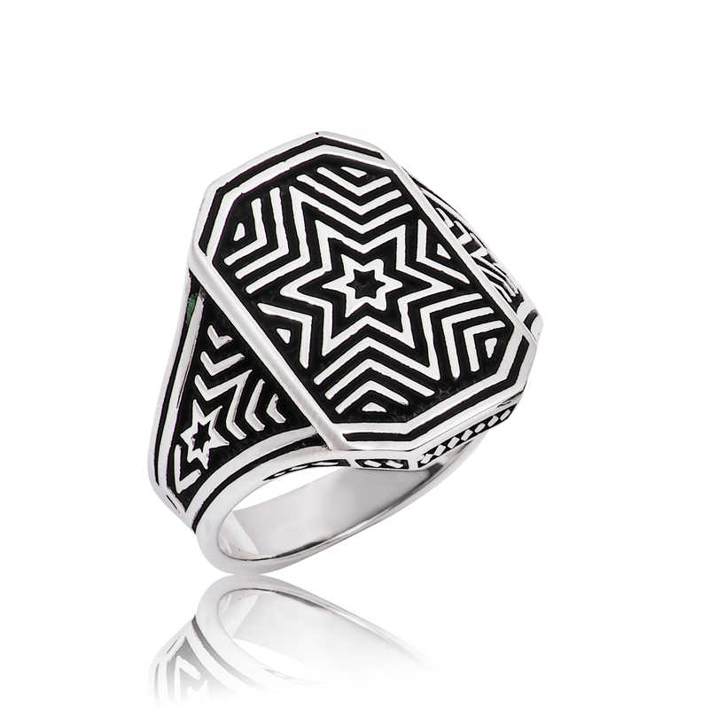 Klasik ve şıklıktan ödün vermeyenler için tasarlanan bu geometrik desenli şık yüzük; 925 ayar gümüşten imal edilmiştir. Gümüş üzerine oksit kaplama yapılmıştır. Tüm gümüş erkek yüzüklerinde olduğu gibi gümüş yıldız desenli erkek yüzük de tamamı el emeği ile üretilmiştir. Bu mükemmel yüzük; doğum günü hediyesi, babalar günü veya özel günlerde tercih edilebilecek mükemmel bir seçenektir. Gümüş ve değerli taşlar nedeniyle belirtilen ortalama ürün ağırlığında ± %10 sapma olabilmektedir.