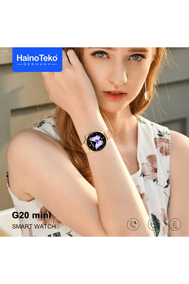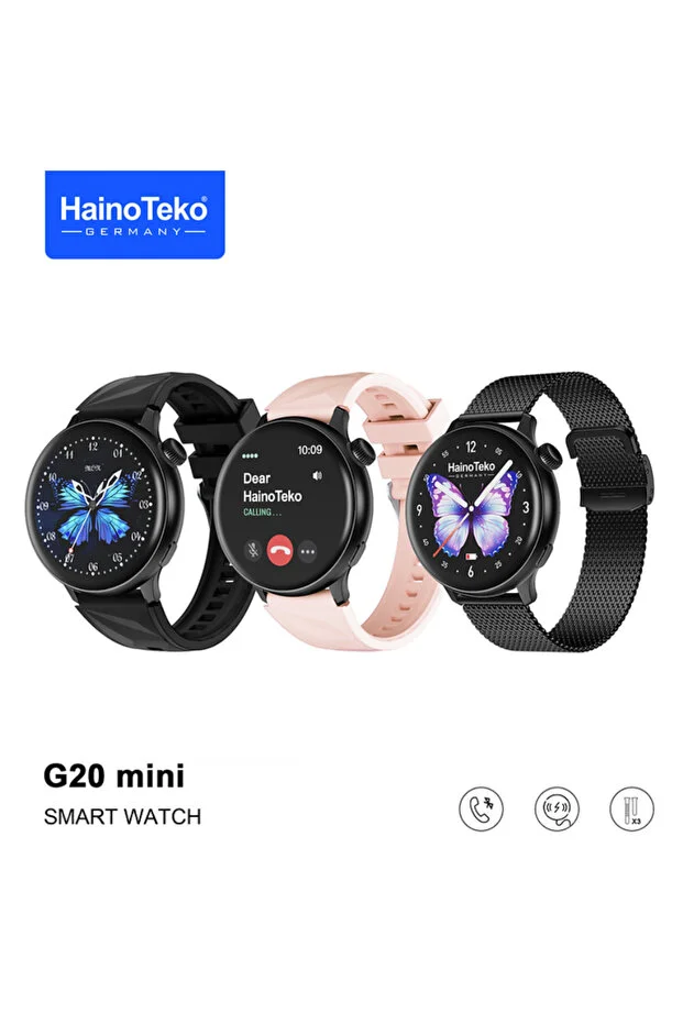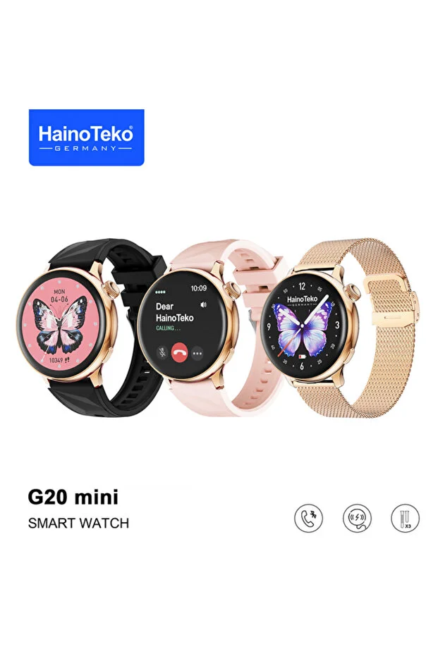 Haino Teko G20 Mini akıllı saat, kadın kullanıcılar için tasarlanmış kompakt yapıya sahip bir akıllı saat modelidir. 3 adet değiştirilebilir kordon ile farklı kullanım tarzlarına uyum sağlar.