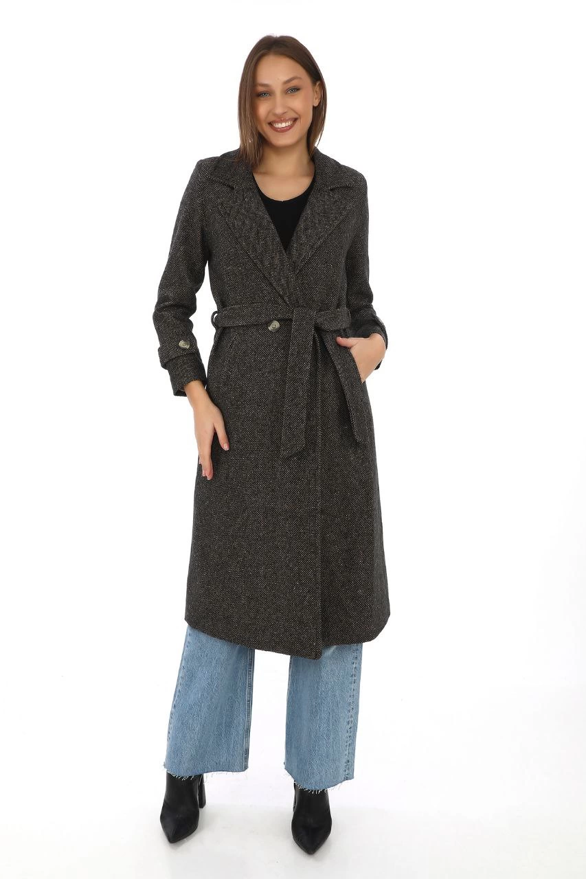 Kadın Balık Sırtı Kaşe Kaban Uzun Boy Kruvaze Yaka Kuşaklı Astarlı Tesettür – Kahverengi