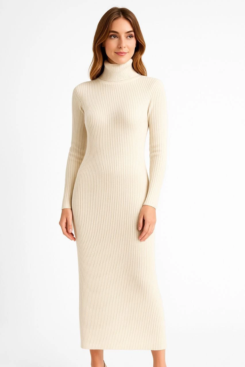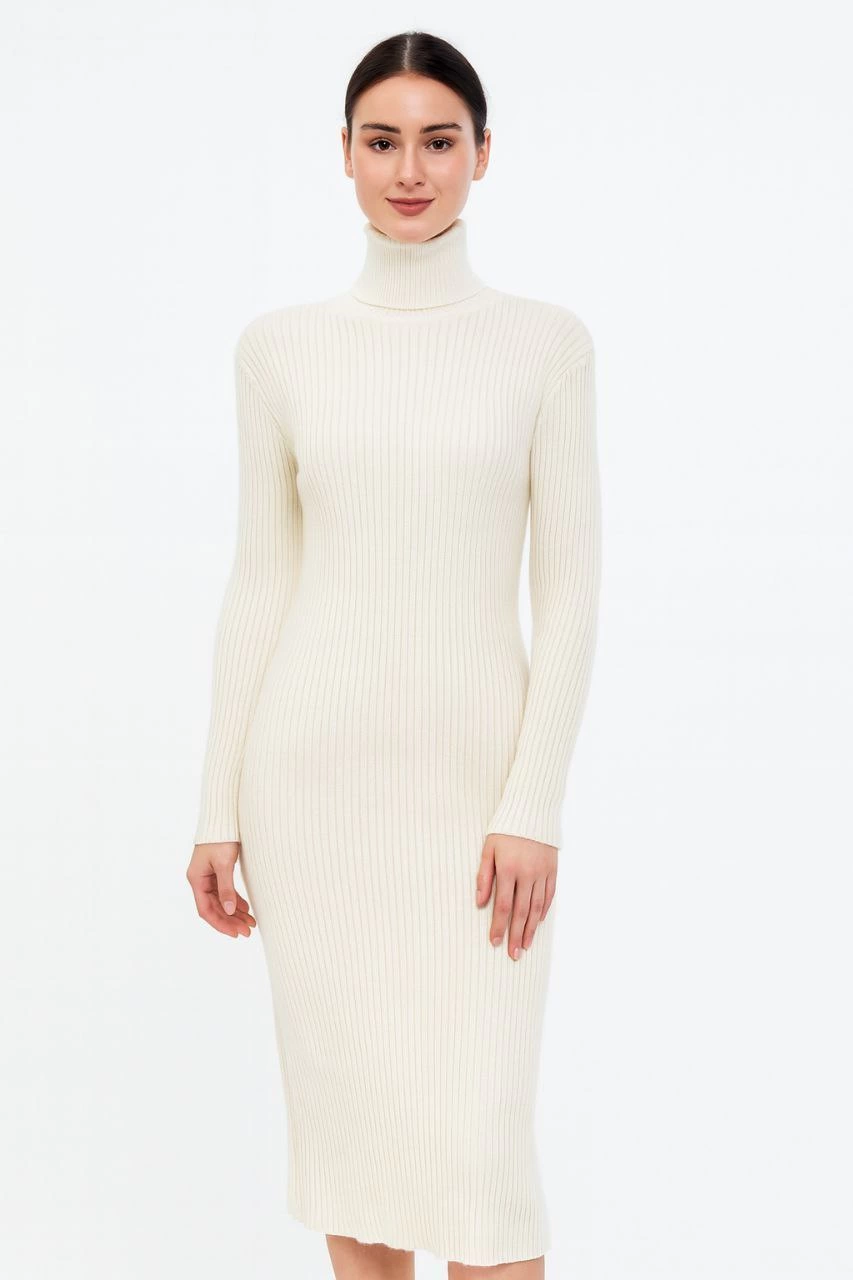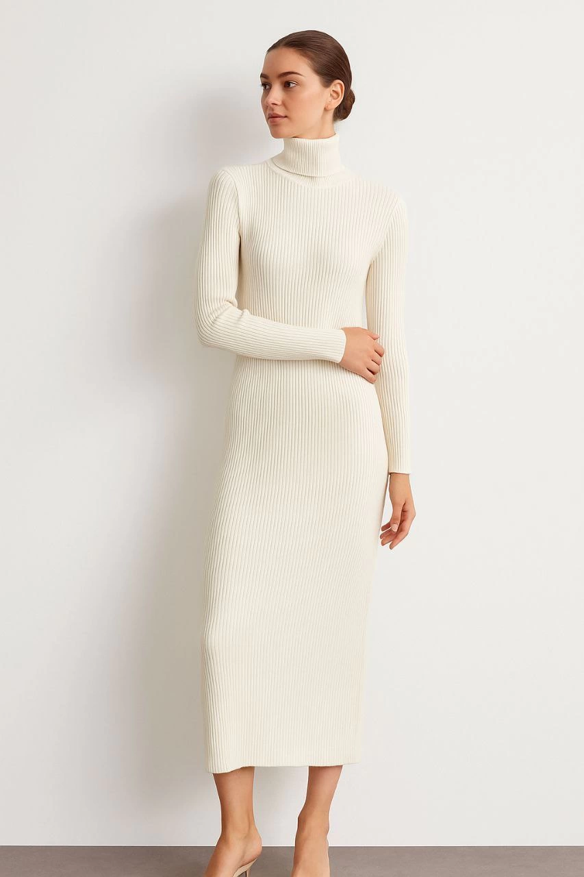 Kadın Boğazlı Triko Elbise Uzun Fitilli Esnek Dokuma Tam Kalıp Baharlık 130 cm – Beyaz