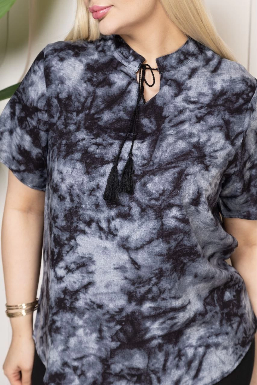 Kadın Desenli Püsküllü Viskon Bluz Bebe Yaka Kısa Kollu Big Size Rahat Kesim – Desenli