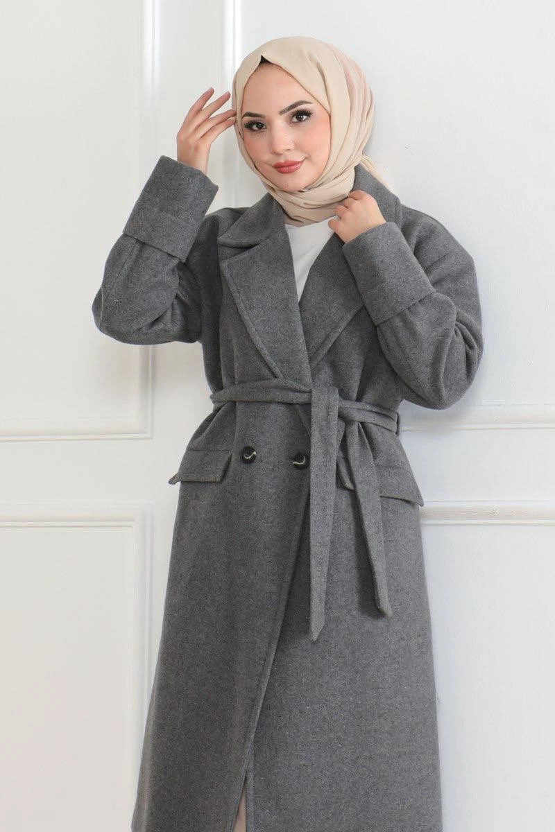 Kadın Kaşe Kaban Uzun Boy Kruvaze Yaka Kuşaklı Tesettür Kaşe Kaban Astarlı Yünlü – Gri