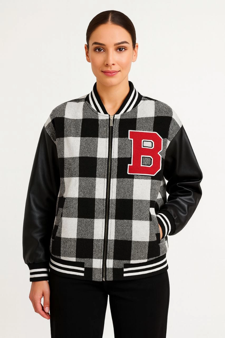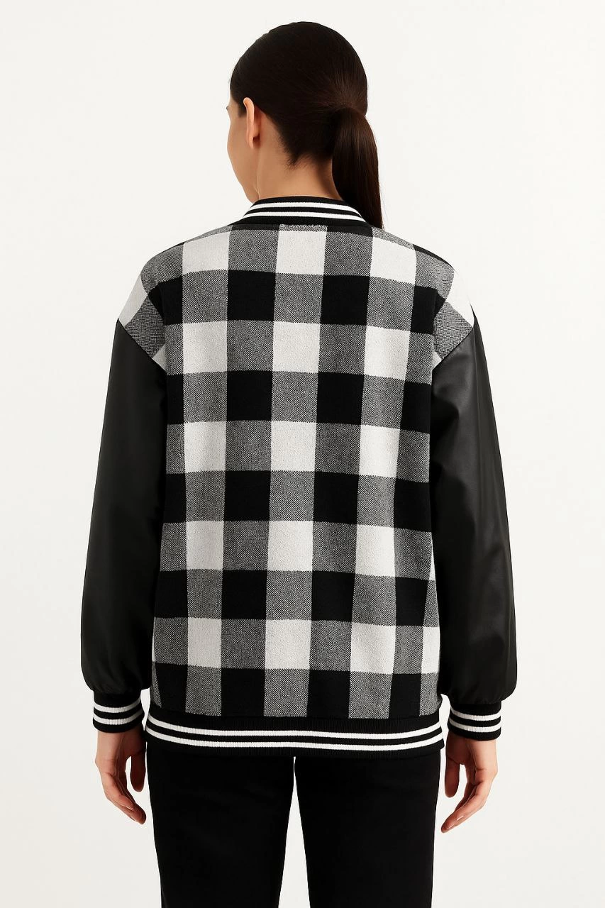 Kadın Kolej Ceket Kareli Oduncu Kolları Suni Deri Fermuarlı İçi Kapitone Astarlı – Gri