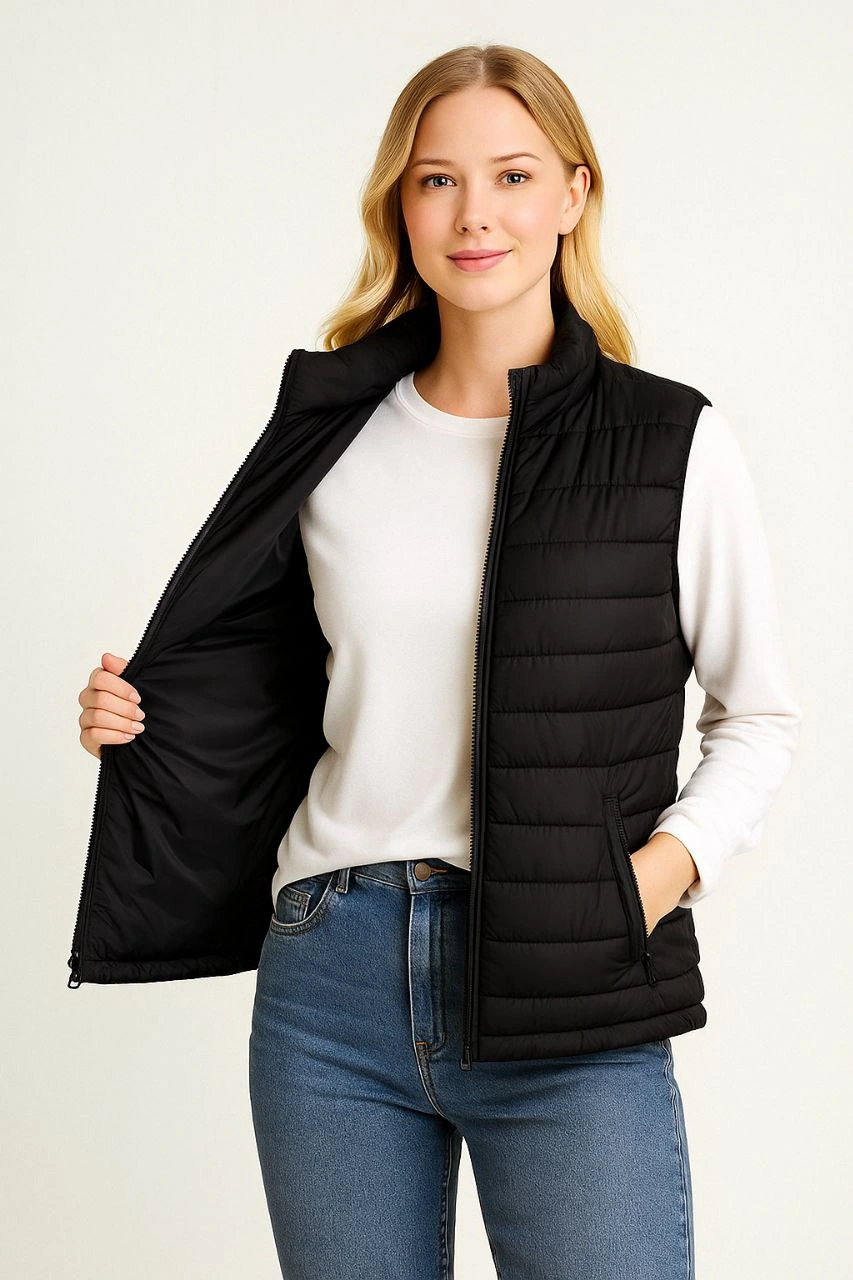 Kadın Şişme Fermuarlı Yelek Su itici Kapitone Astarlı Cepli Hafif Spor Kalıp – Siyah