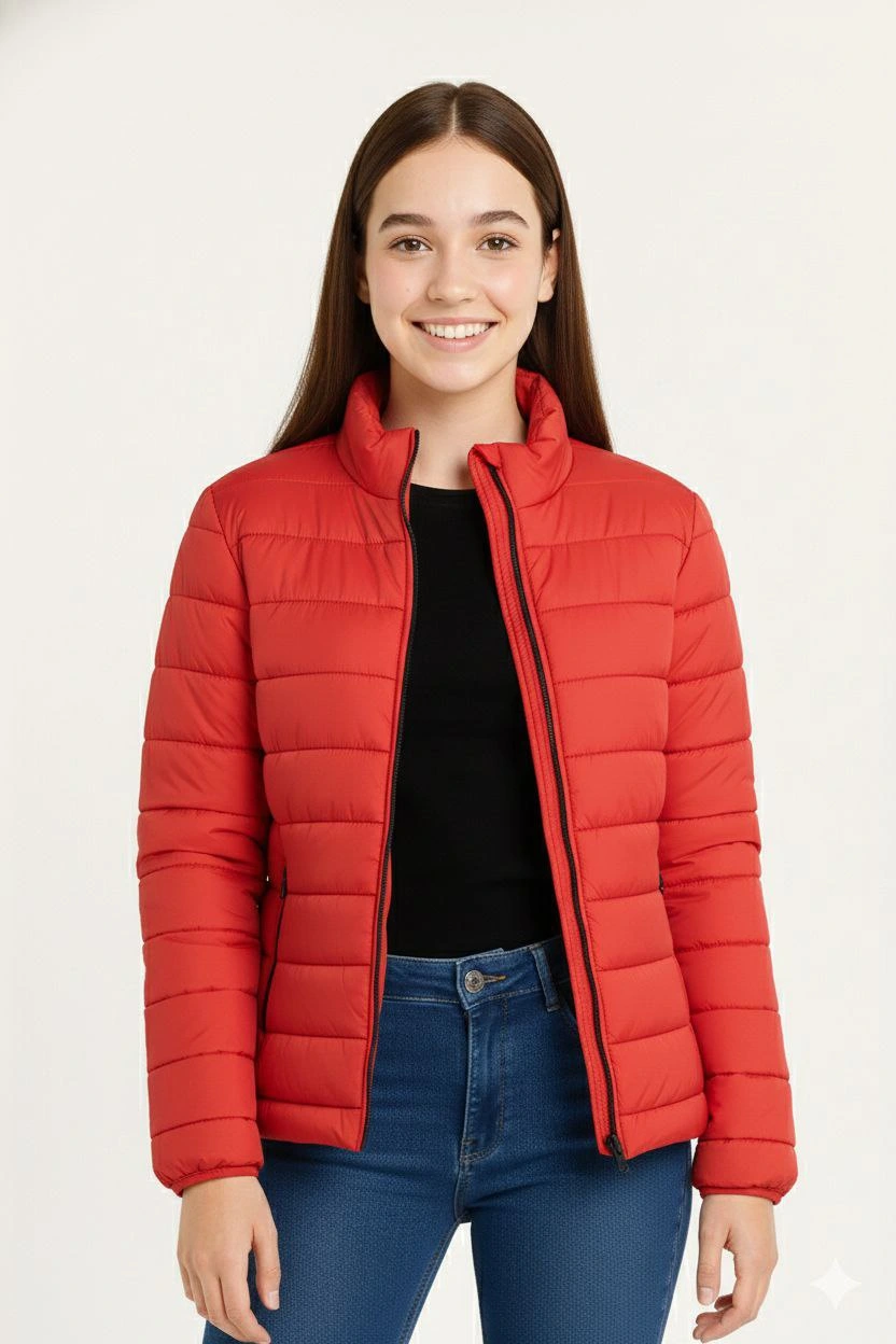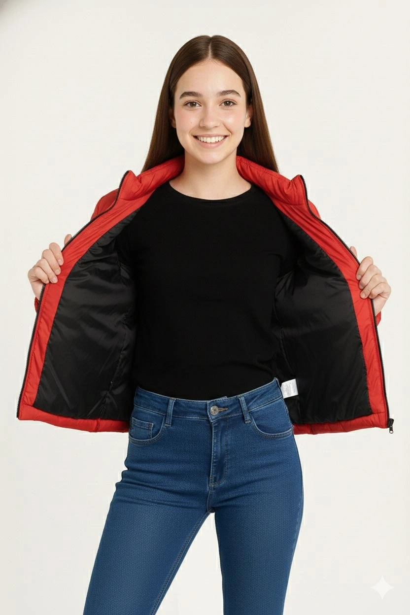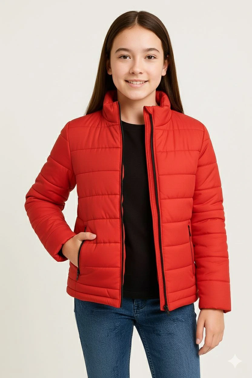 Kız Çocuk Şişme Mont Hafif ve Sıcak Tutucu Fermuarlı Su İtici Mont Kapüşonuz – Kırmızı
