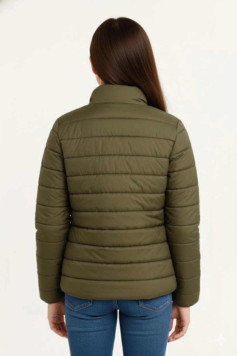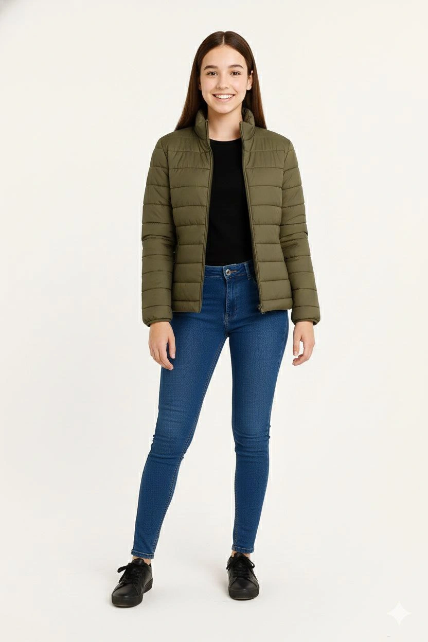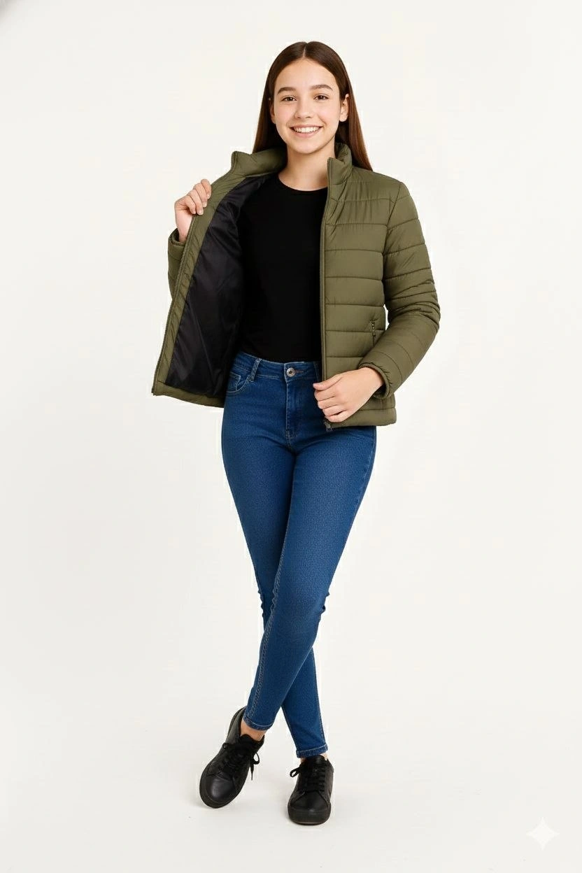 Kız Çocuk Şişme Mont Hafif ve Sıcak Tutucu Fermuarlı Su İtici Mont Kapüşonuz Modern – Haki