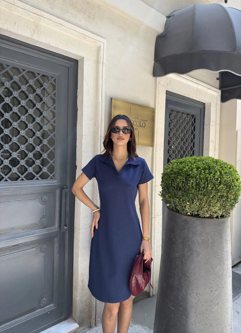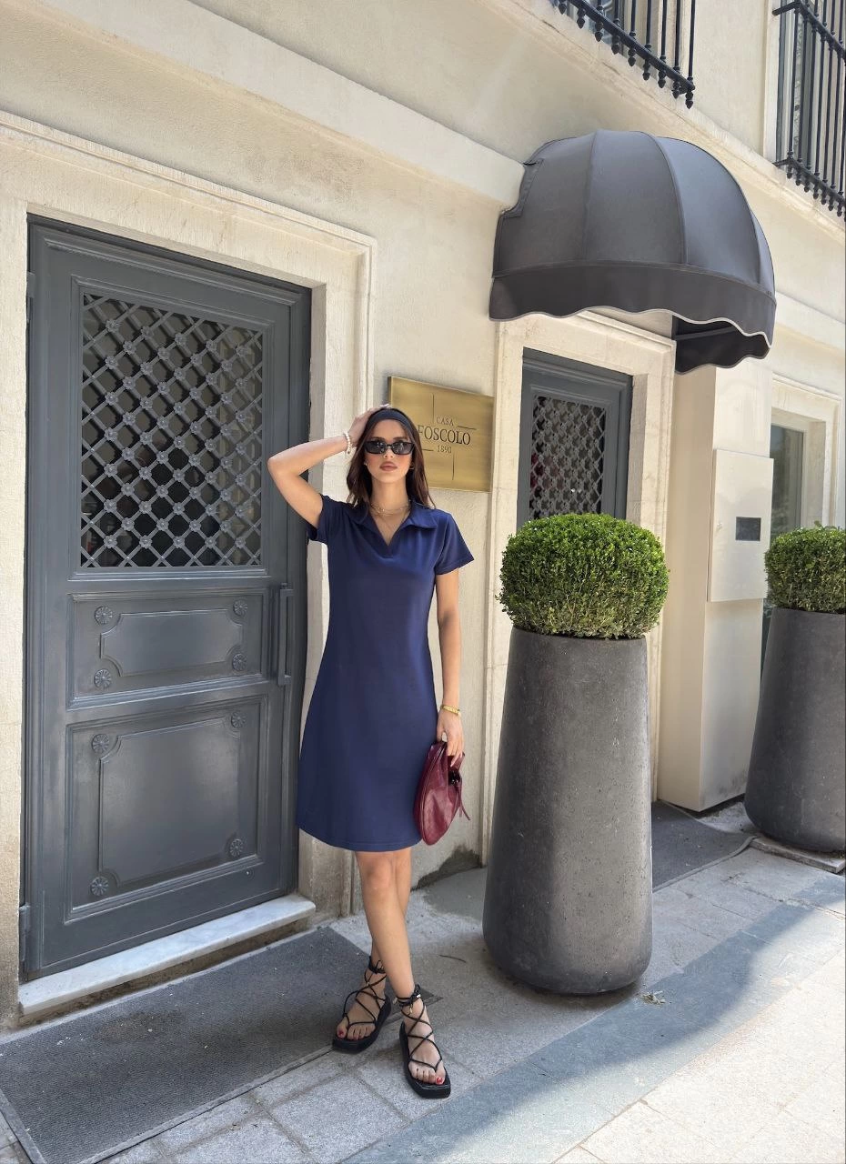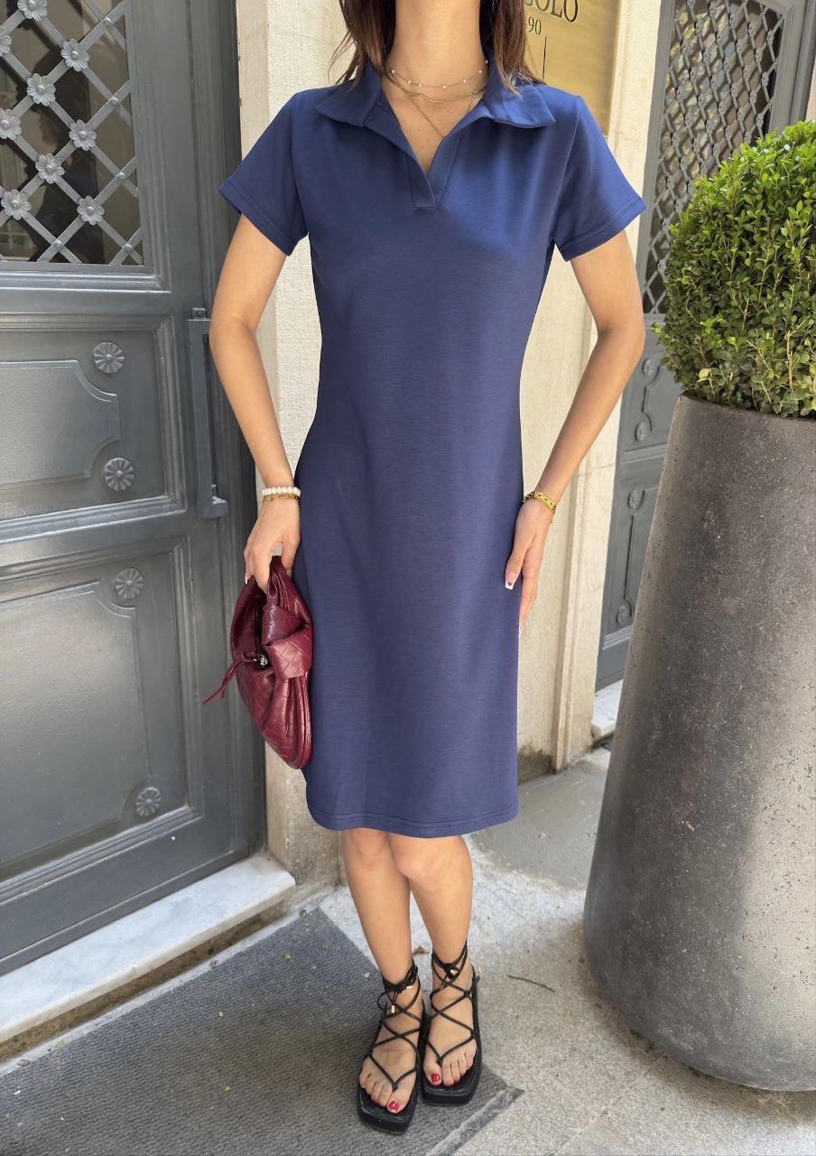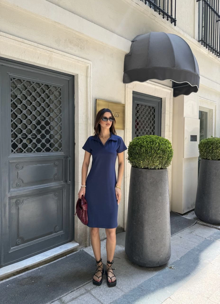 Osy Modal Yumuşak Dokulu Yakalı Kısa Kollu Elbise – Mavi