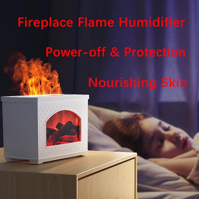270ml şömine alev difüzörü; ultrasonik soğuk sis teknolojisi, simüle alev efekti, sessiz çalışma ve otomatik kapanma özellikleriyle yatak odası ve ofis kullanımı için ideal aroma ve nemlendirici cihazdır.