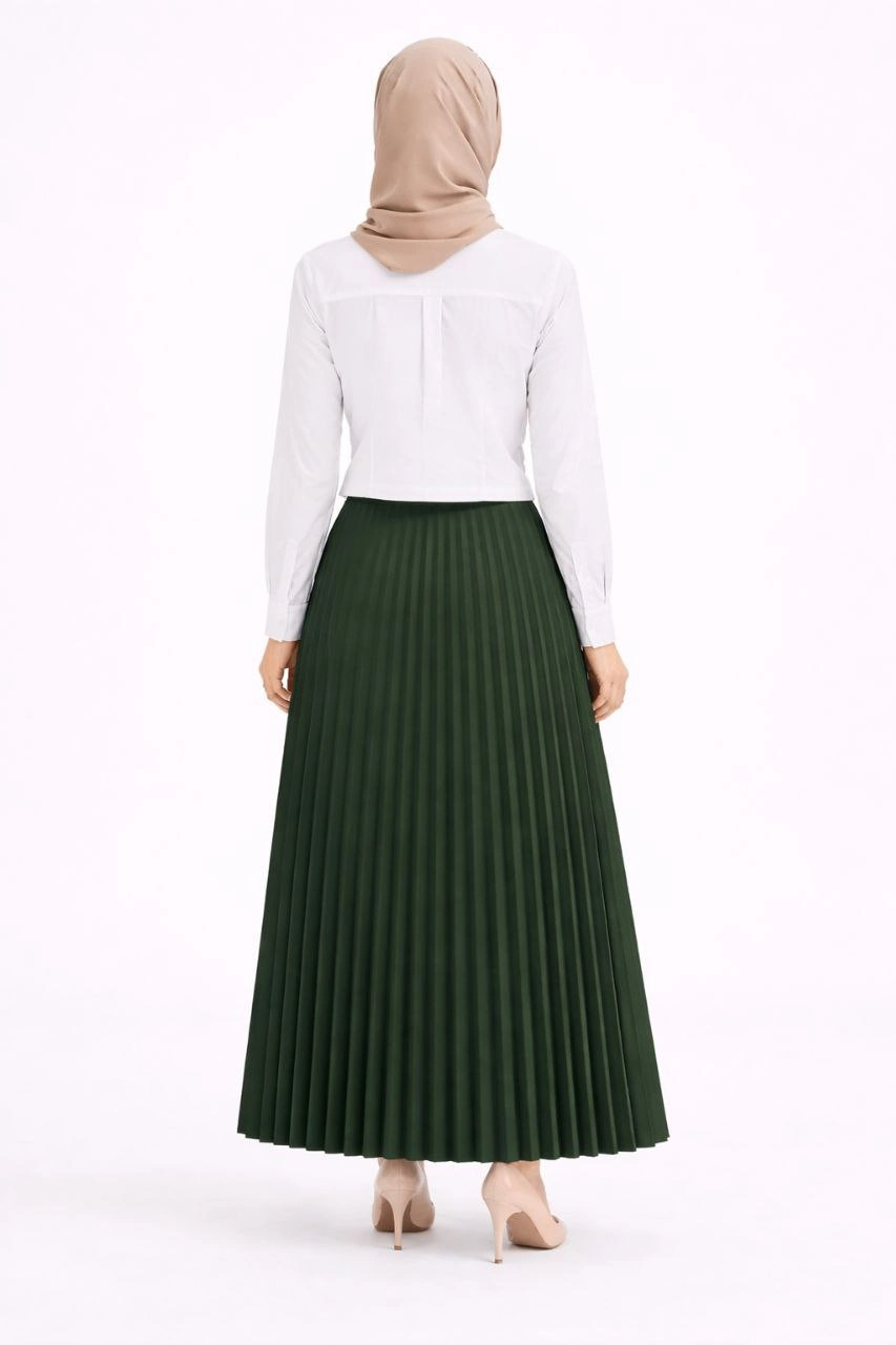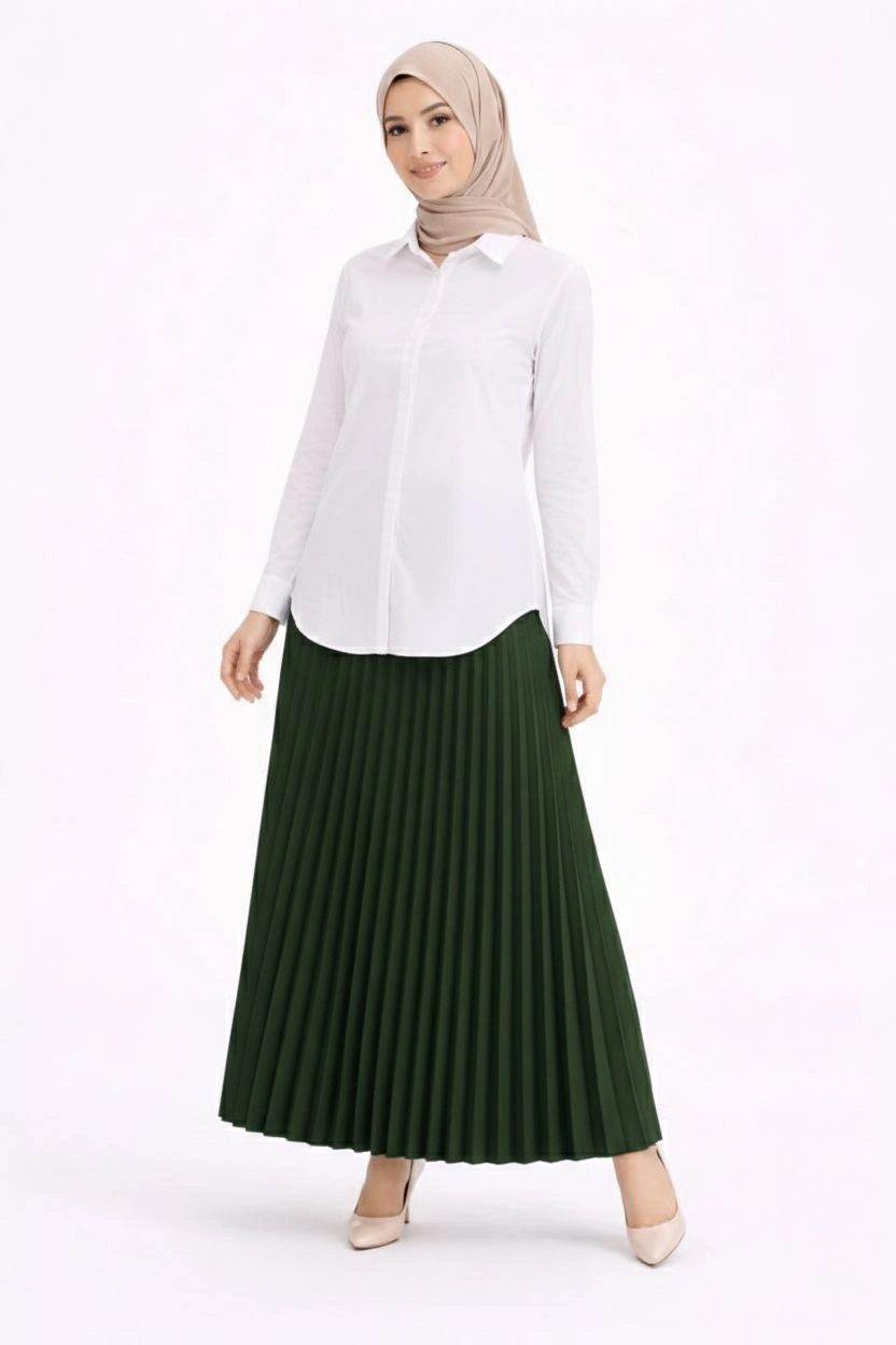 Tesettür Beyaz Gömlekli Pliseli Etek İkili Takım Gündelik ve Ofis Şıklığı – Çağla Yeşili
